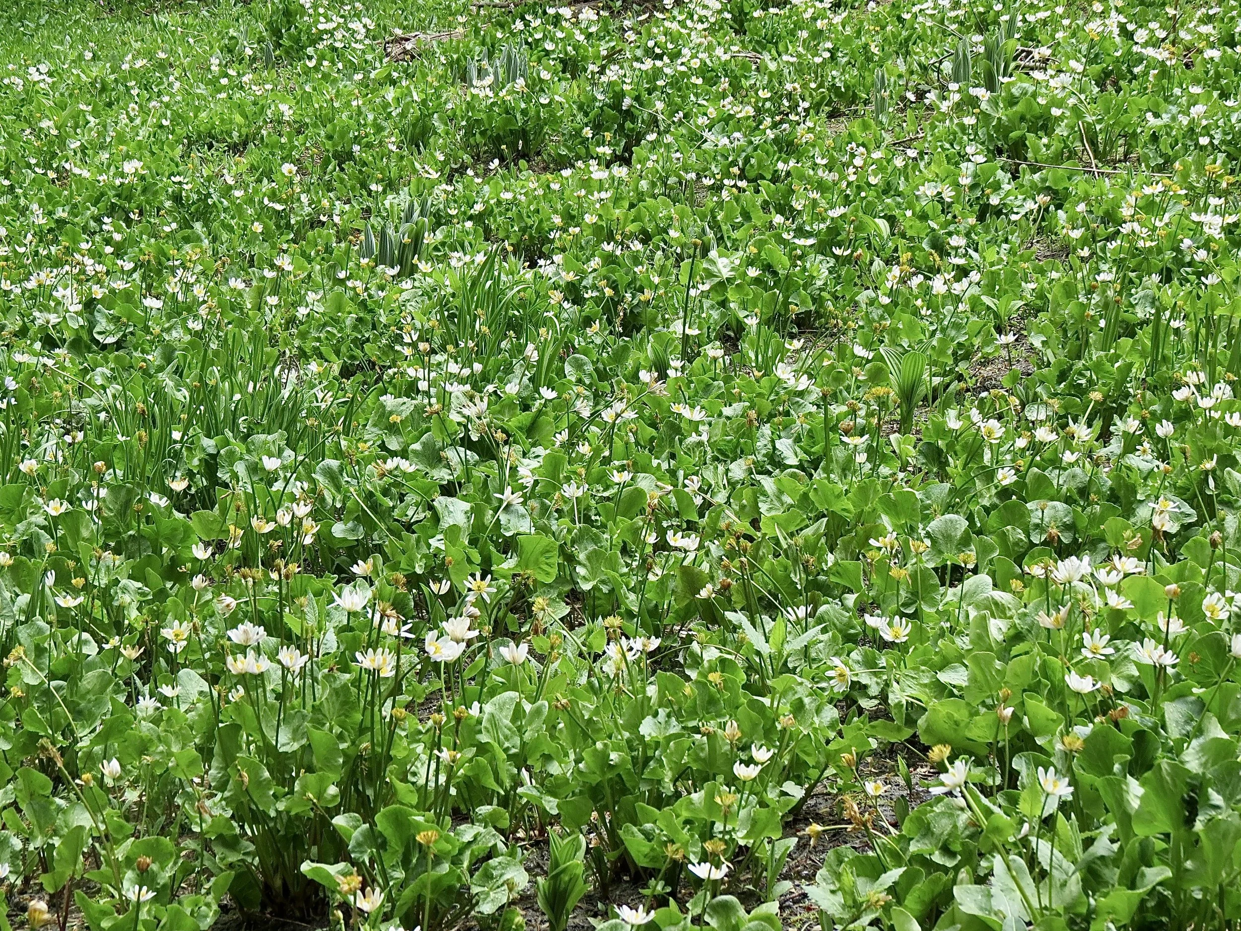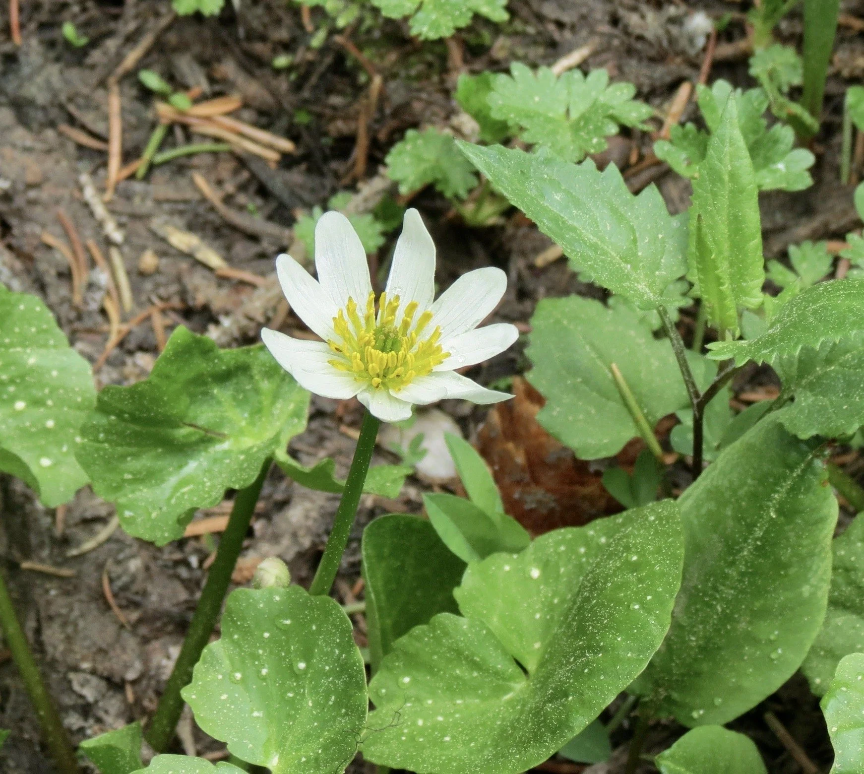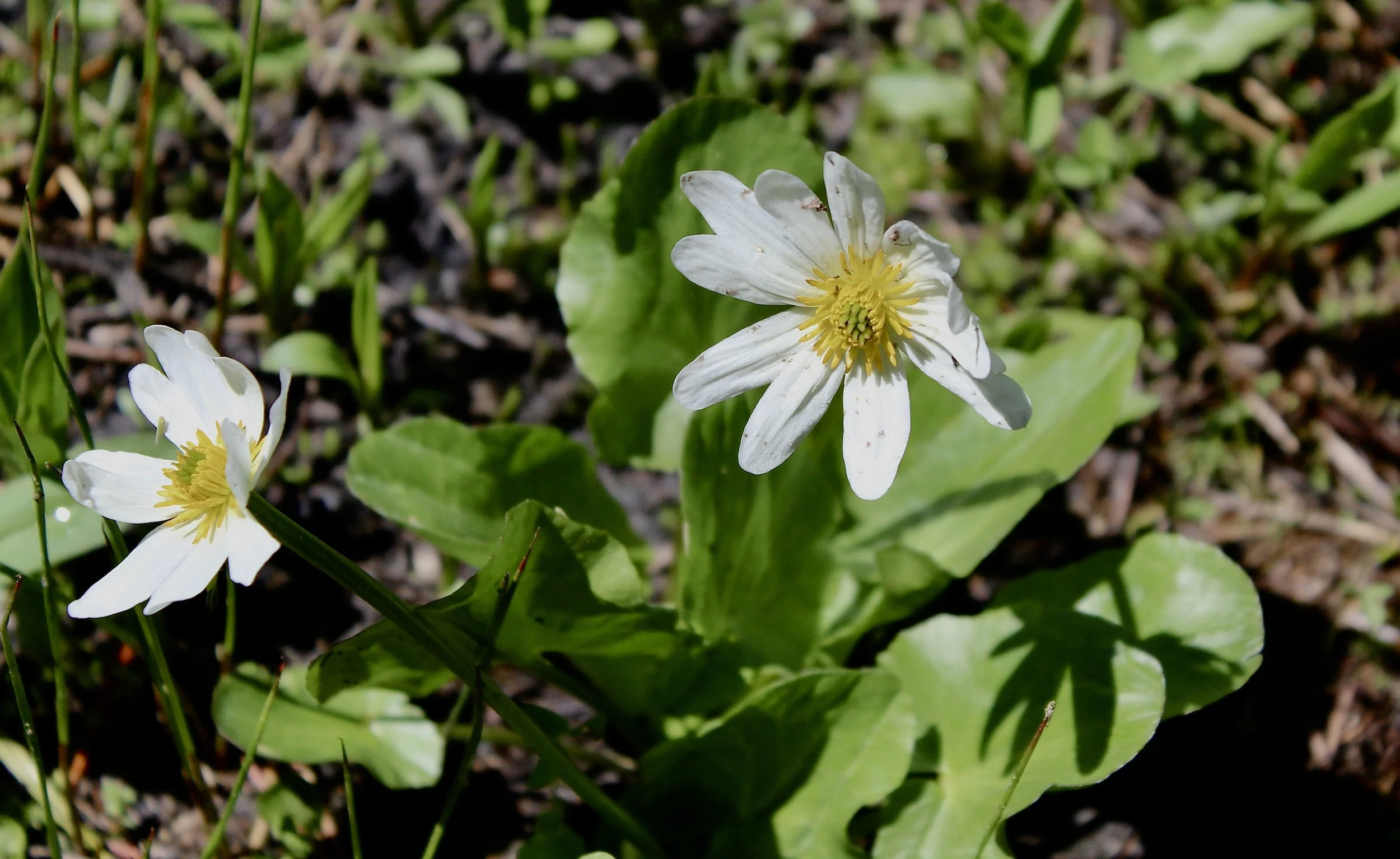 Usually there are two flowers per plant. There are no petals, only white sepals, anywhere from six to twelve. These wildflowers grow in moist soil, like marshes and pond edges, often in large groupings. Stamens are yellow and many. The leaves are round and lobed.
