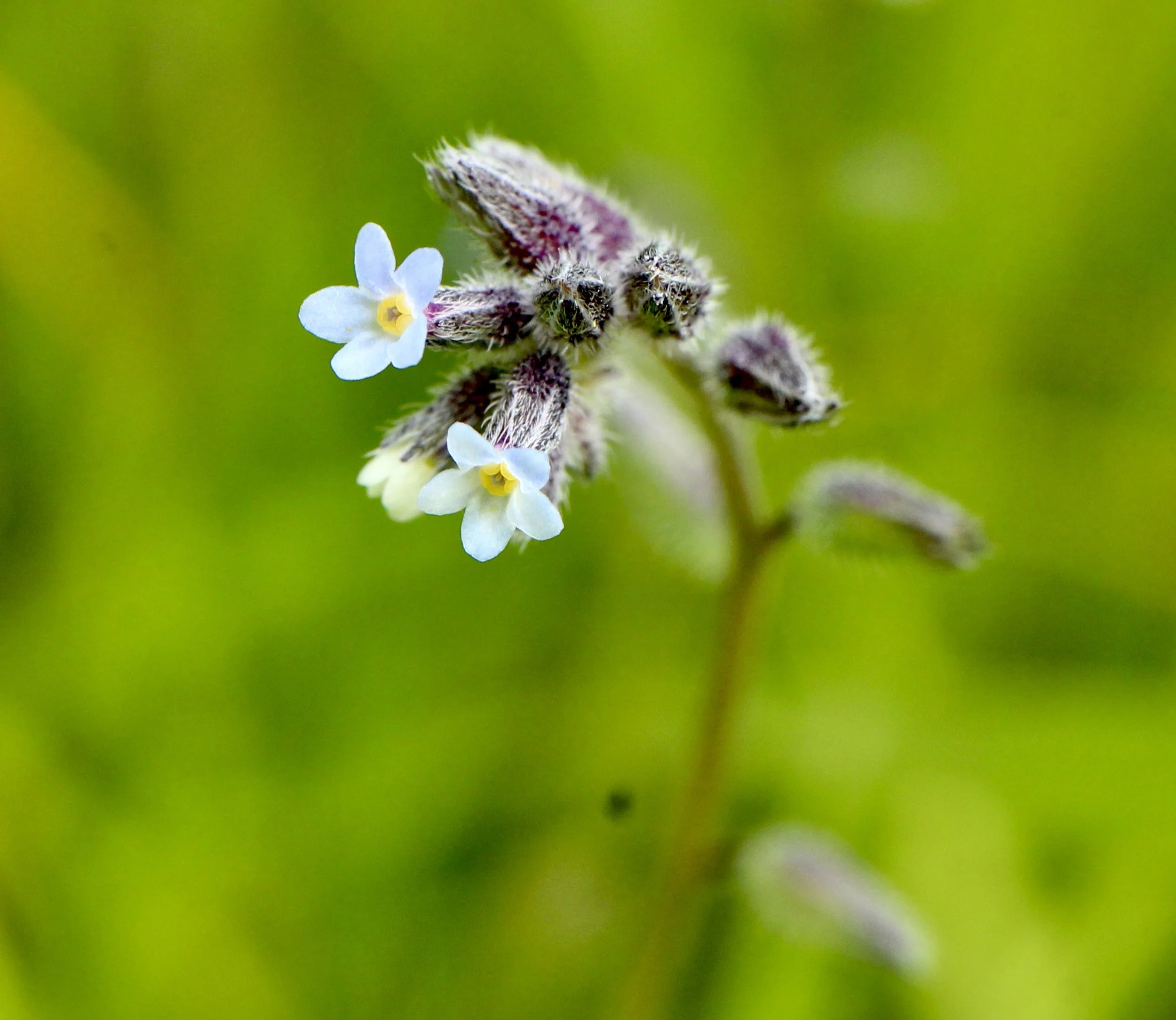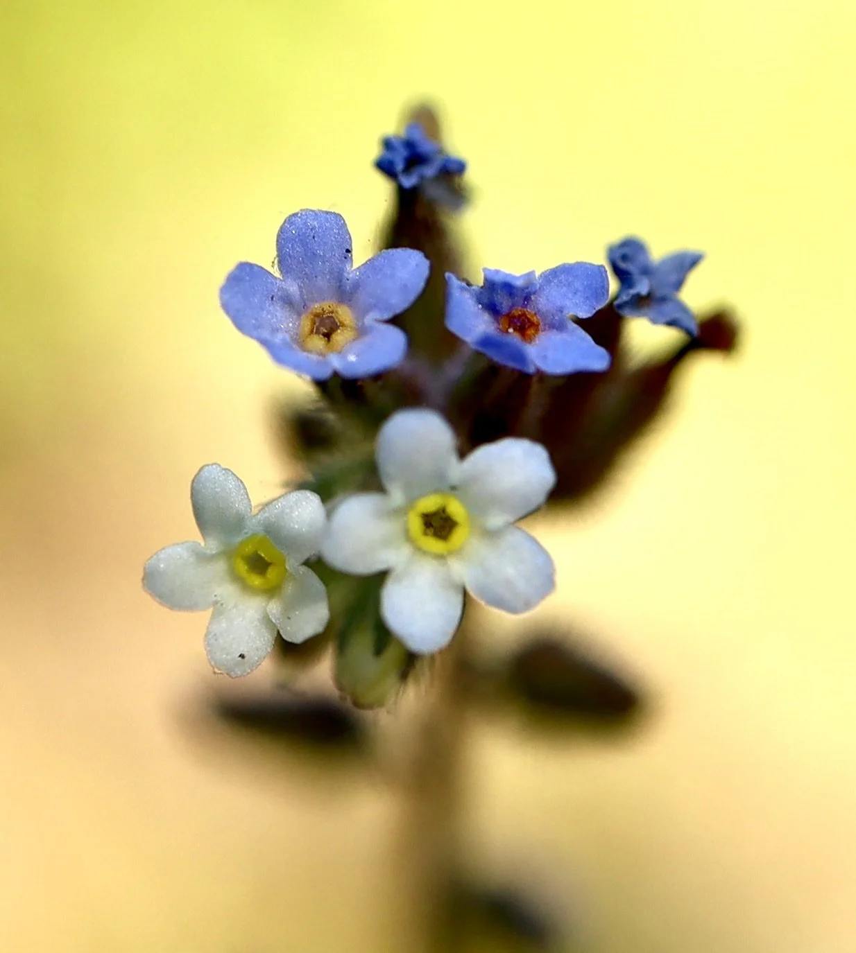 These are tiny wildflowers. The Changing Forget-me-not usually has different colored flowers, starting as yellow and moving to blue sometimes white. The stem, leaves and calyx are all hirsute, having hairs. Leaves are long and slender. This little wildflower grows in disturbed areas and moist meadowy areas.