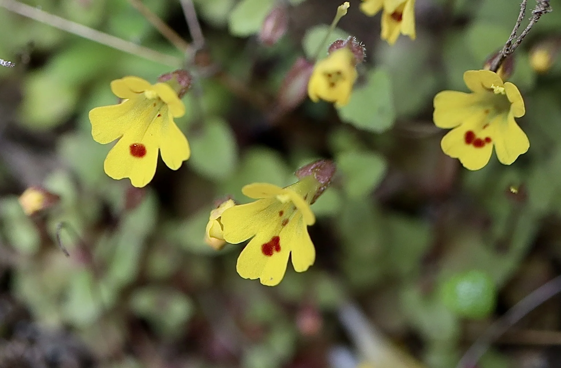 Monkeyflowers are a large family of wildflowers, all of which are very similar. Most have yellow flowers, but there are also red monkeyflowers. The Chickweed Monkeyflower is distinguished from others by the strong red dot on the lower lobe. Look for these in moist soil, often streamside.