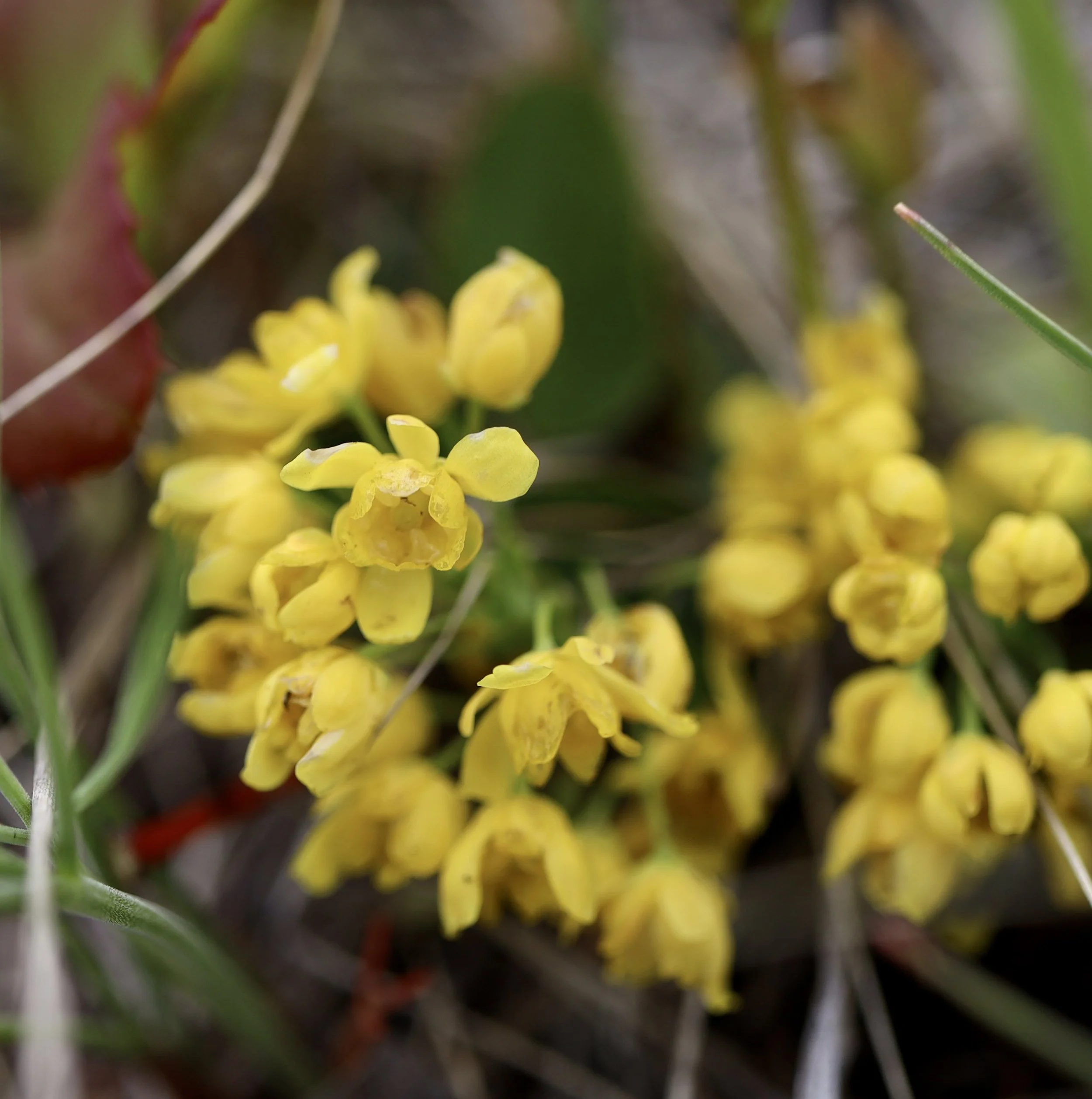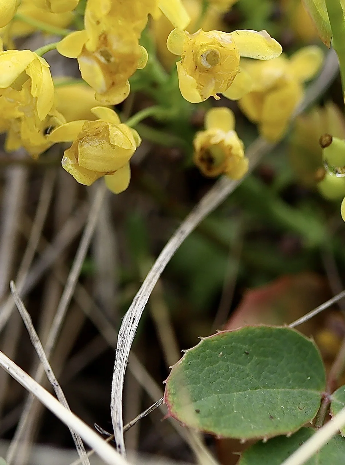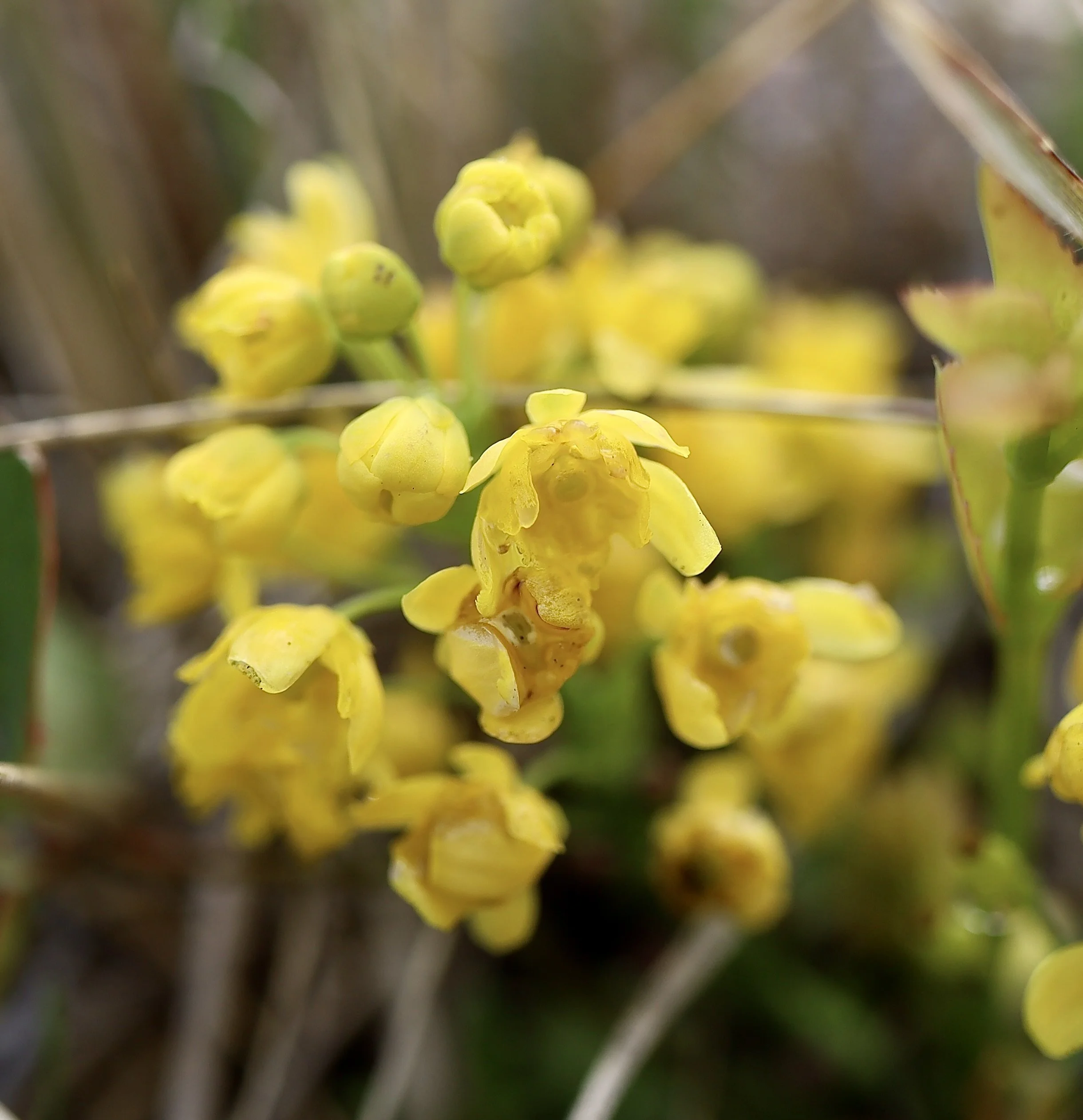Mahonia repens, Creeping Oregon Grape, is a close relative of the Oregon Grape. But this wildflower grows low to the ground and often is hiding under other plants. The flowers are in a cluster at the end of the woody stems. Leaves are ovate and have pointy spines.