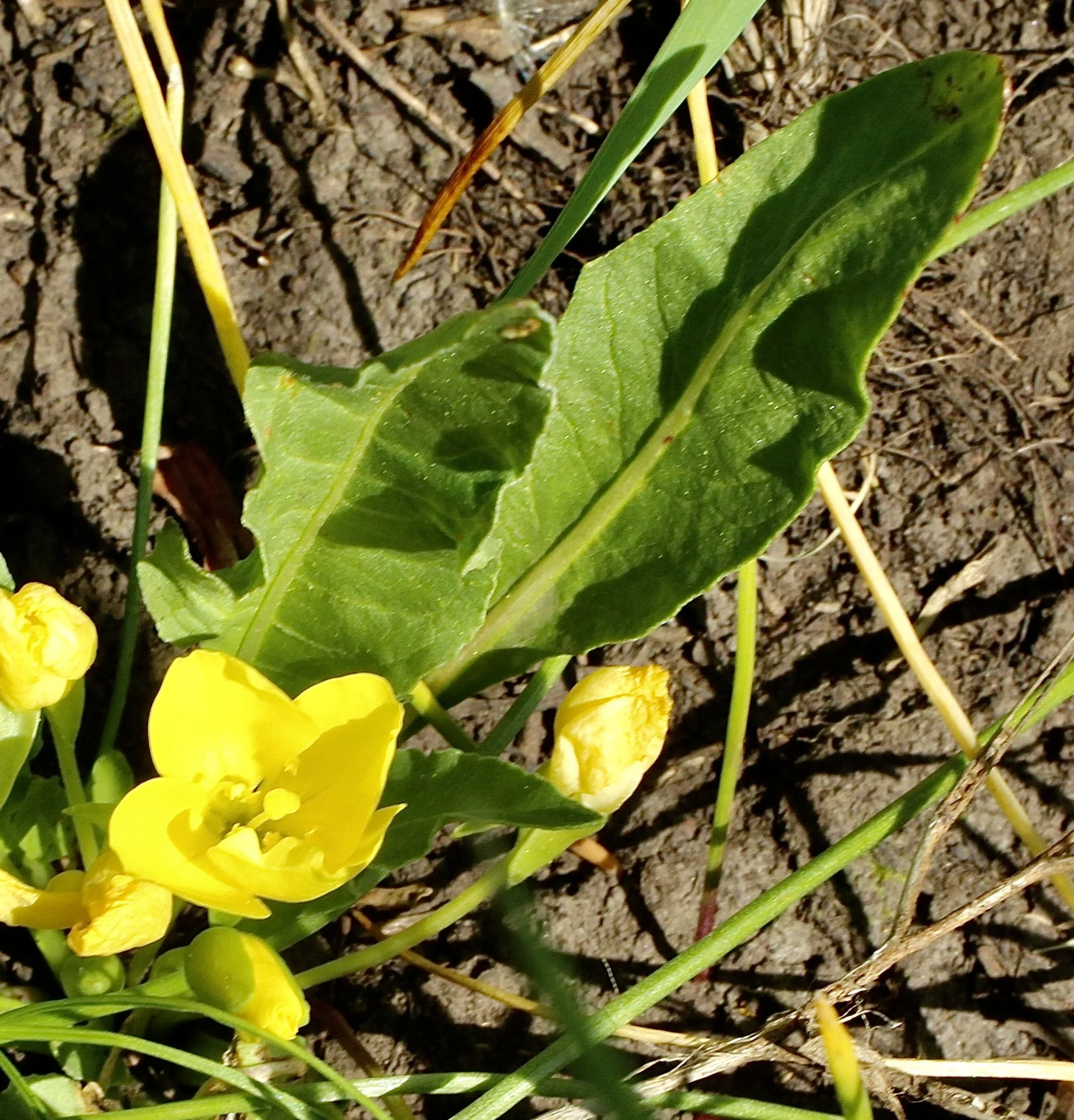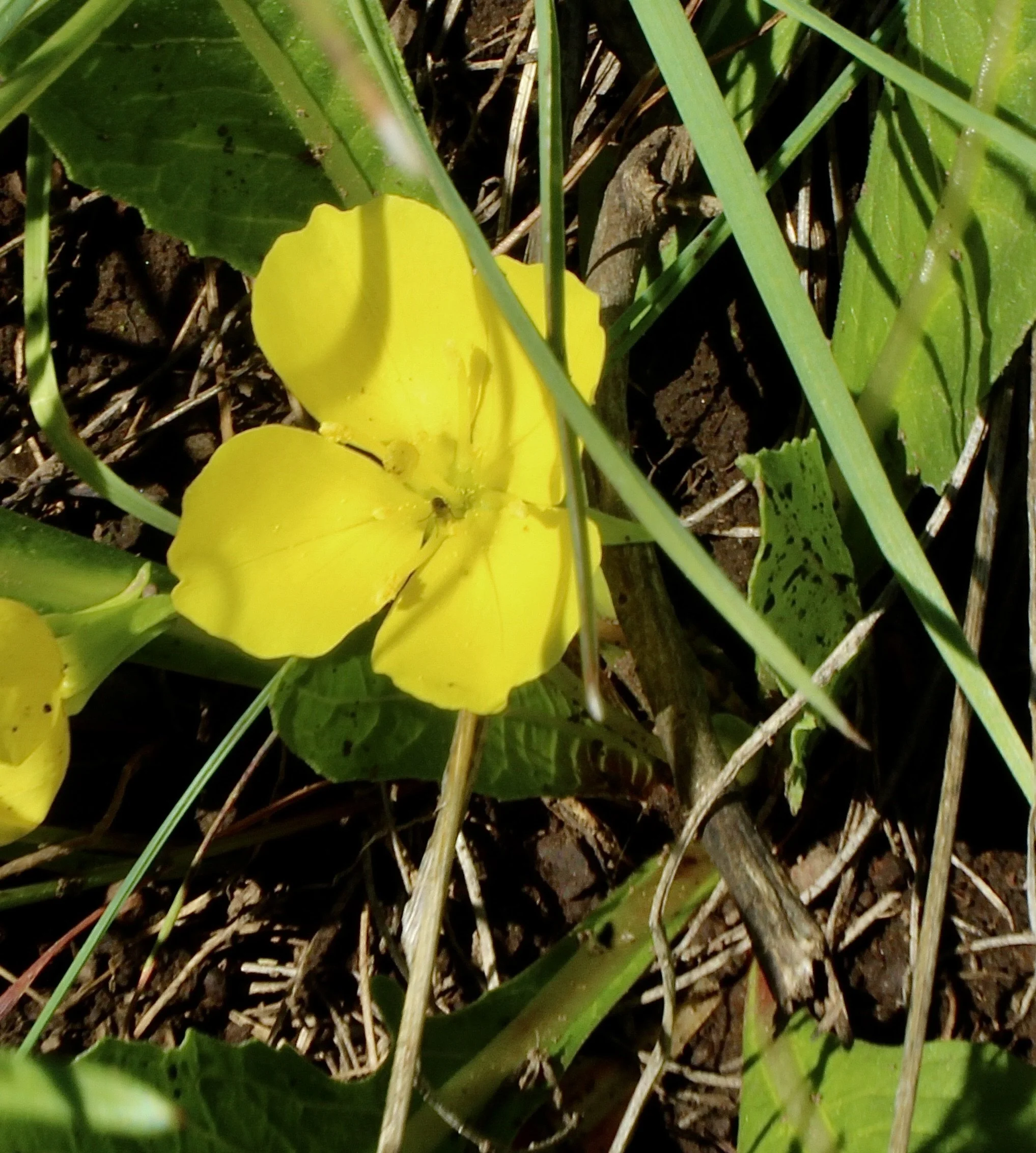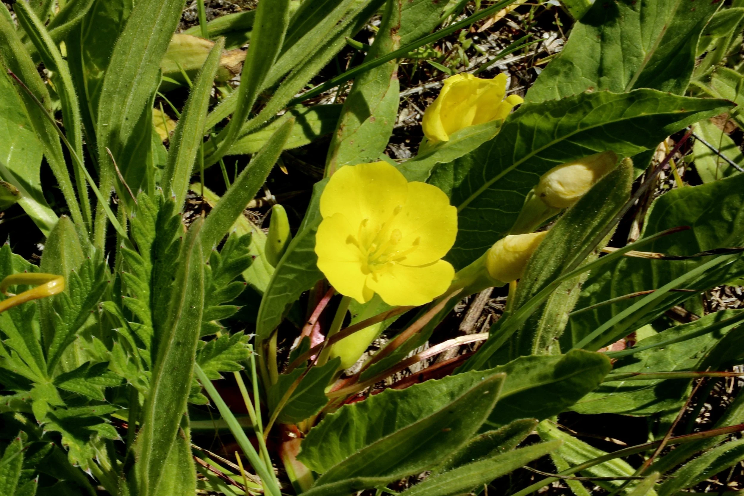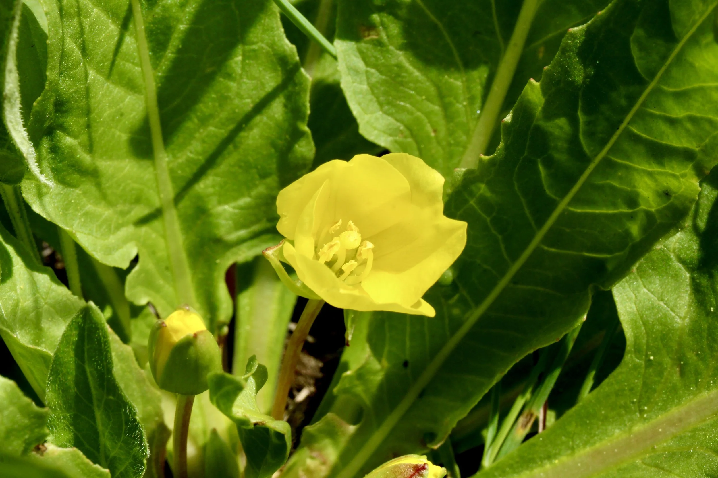The leaves of the Diffuse Flower Evening Primrose form a rosette at the ground while the flowers rise from those leaves. The yellow flowers have four petals and four sepals that fold under the flower. These grow in moist meadows in early spring.