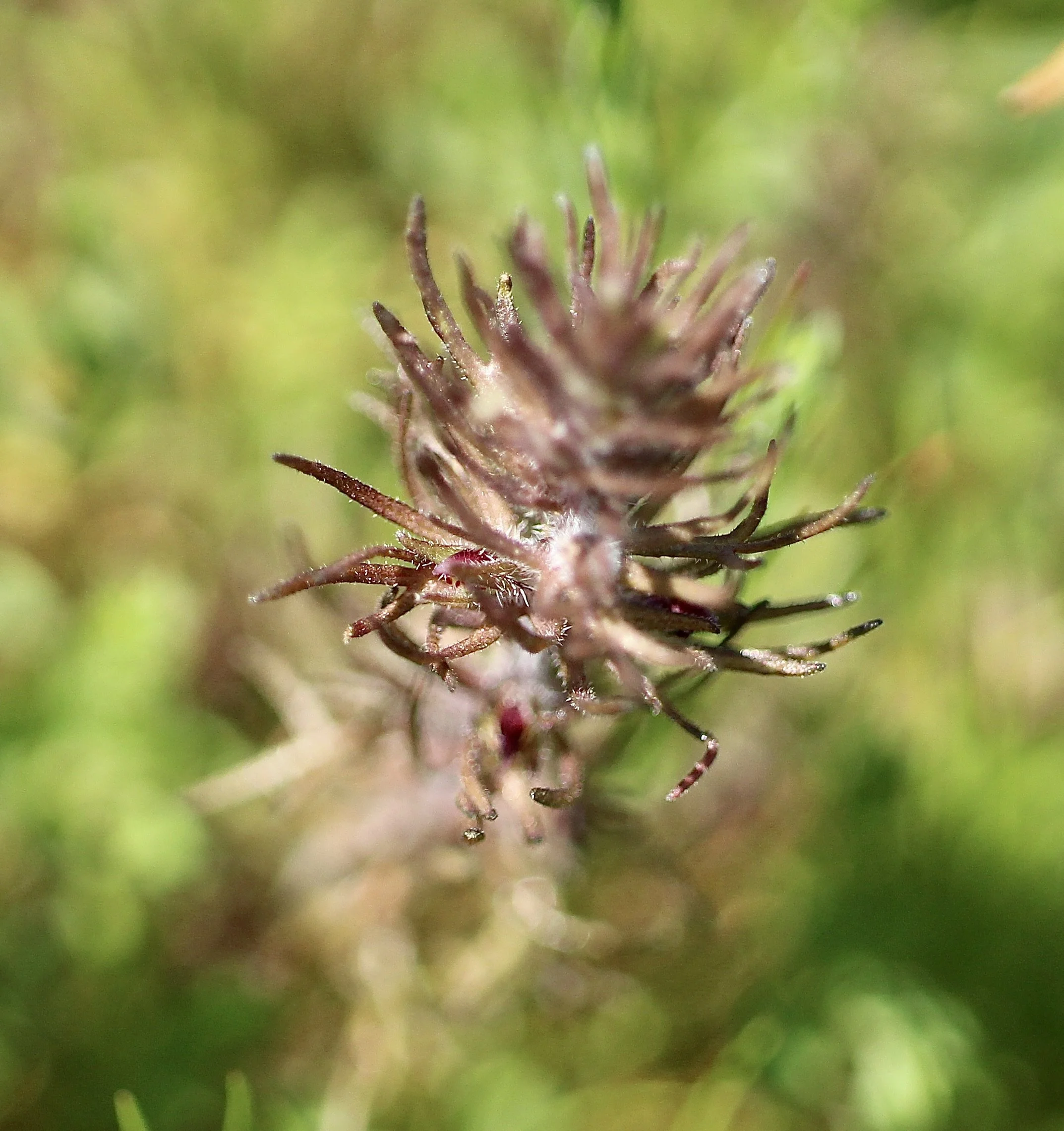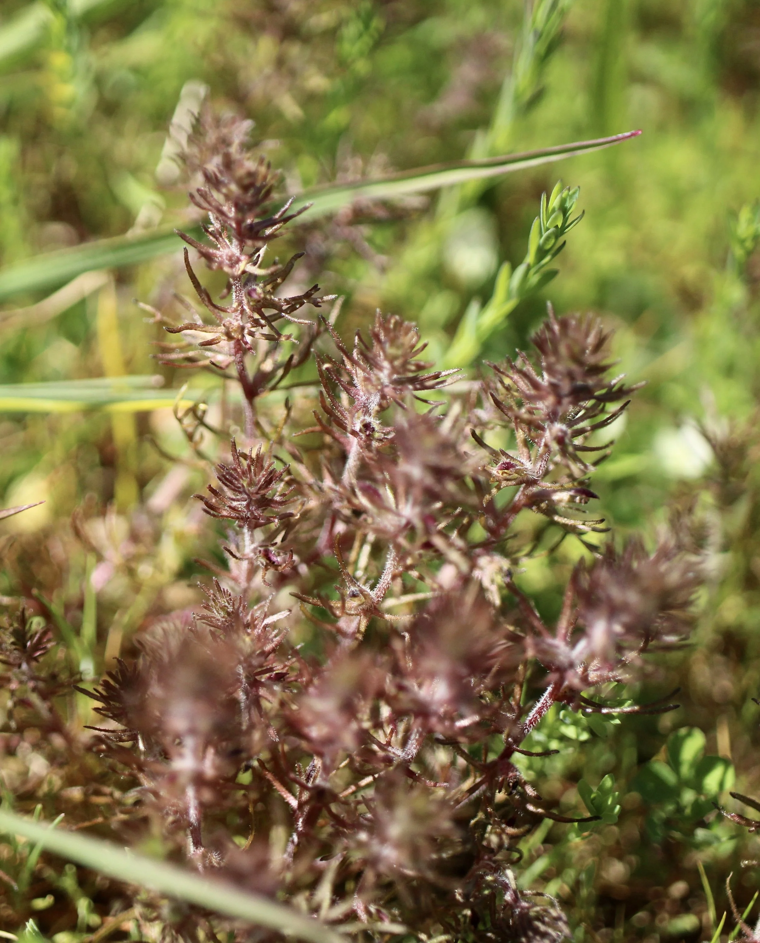 Dwarf Owl’s Clover is unique in that you mostly see the brown to red, covered in tiny hairs. The actual flower is very difficult to see, as it is also reddish in color and very tiny. This plant grows at lower elevations in grasslands.