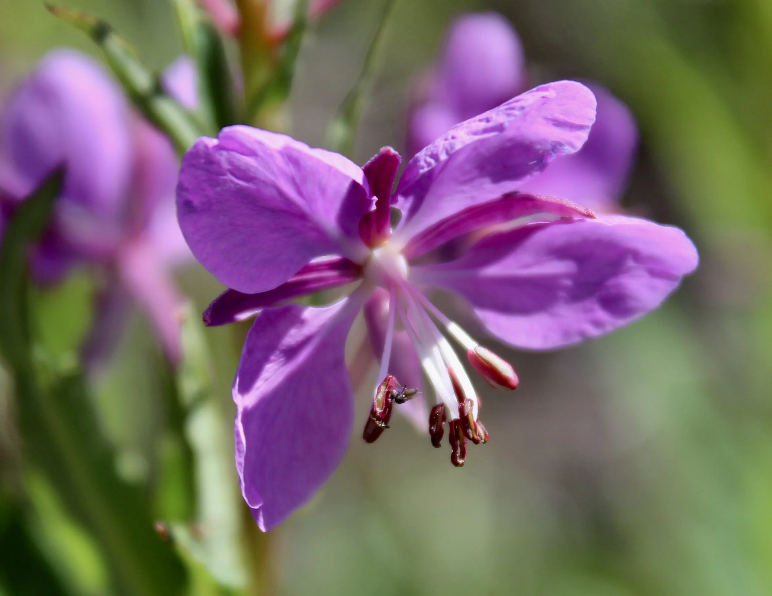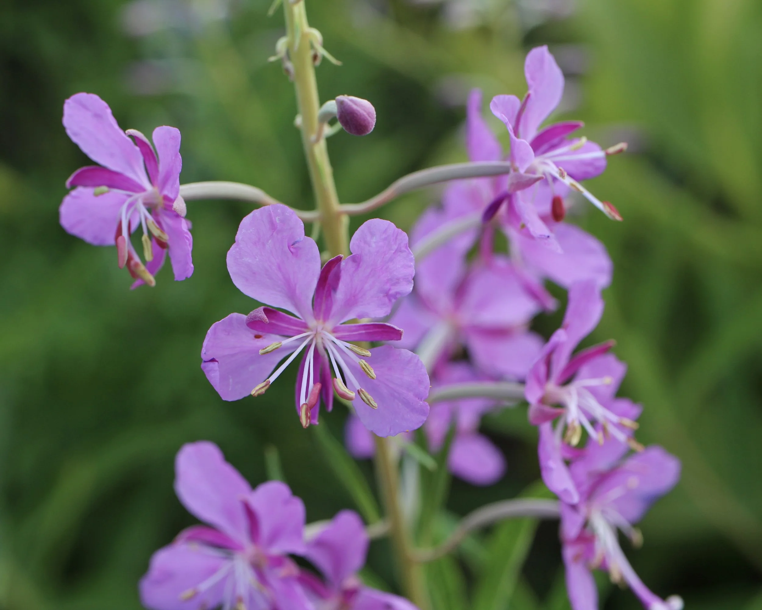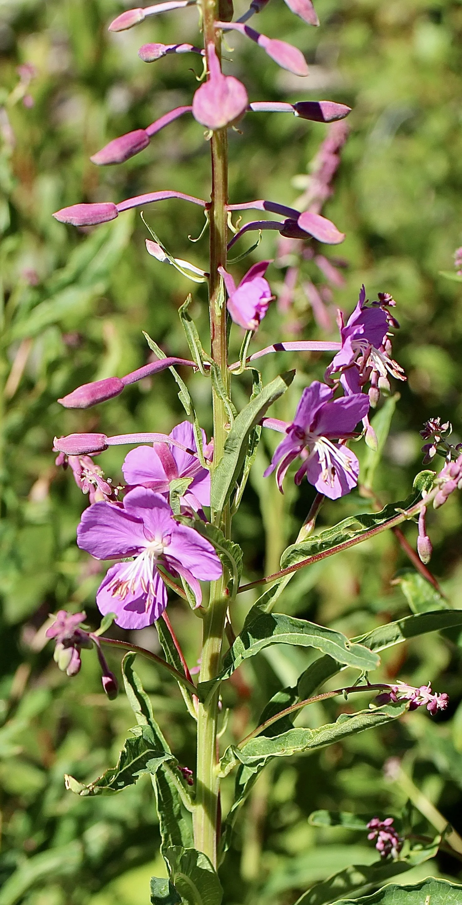 Fireweed is one of the first wildflowers to repopulate after a burn. They can grow to six feet tall, with long leaves alternating as they grow up the stems. The flowers have four petals and four sepals, and are numerous on each stem. Fields fill with this wildflower in mid-summer.