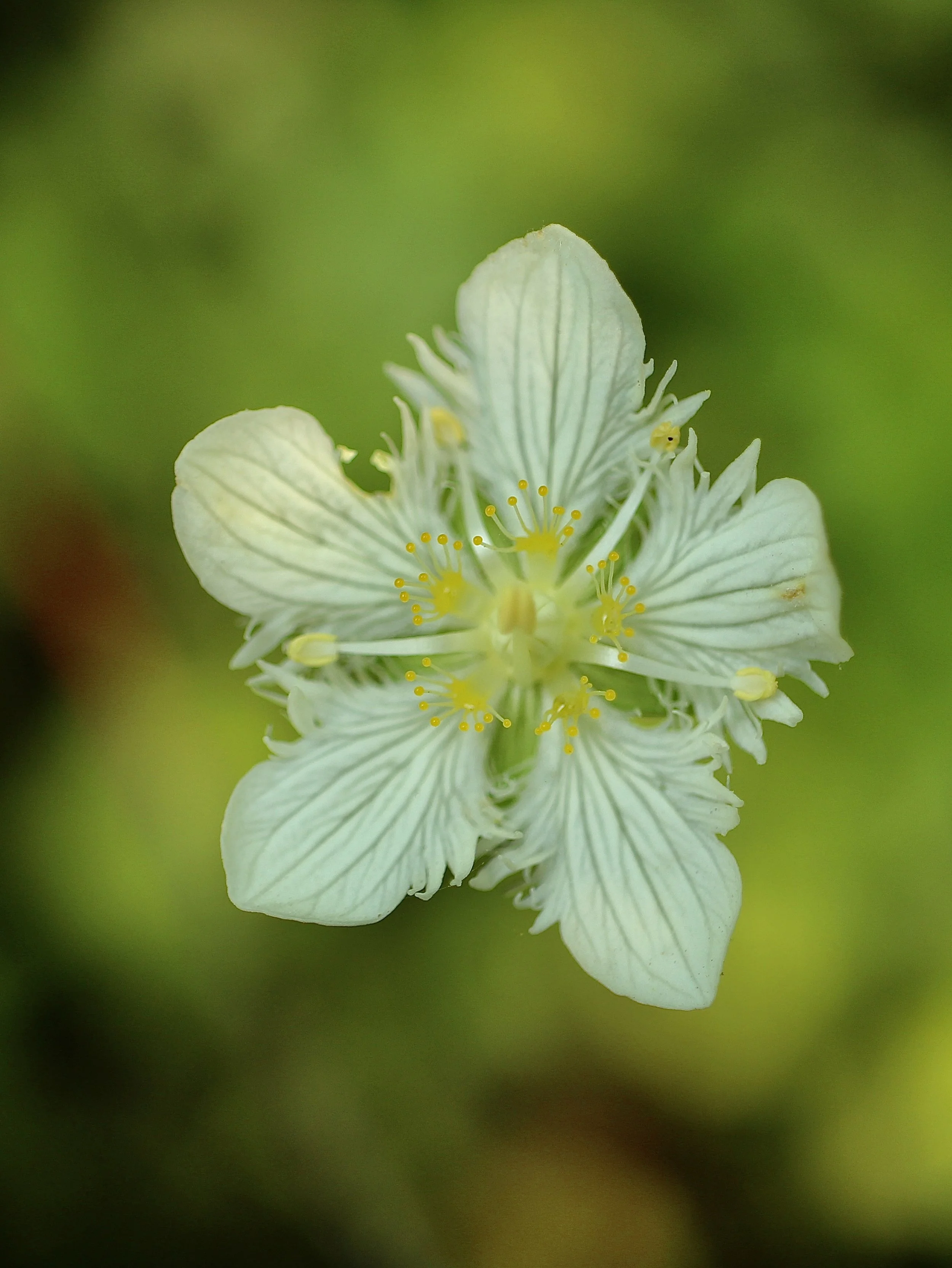 The Fringed Grass of Parnassus has a lacy, delicate look, but lives in sub-alpine and alpine areas in moist soil. There is a single flower on a single stalk, with five white petals which have fringed edges. The five stamens have yellow anthers and are quite visible in helping to identify this wildflower.