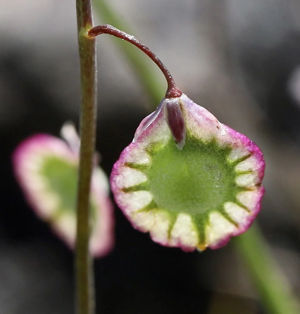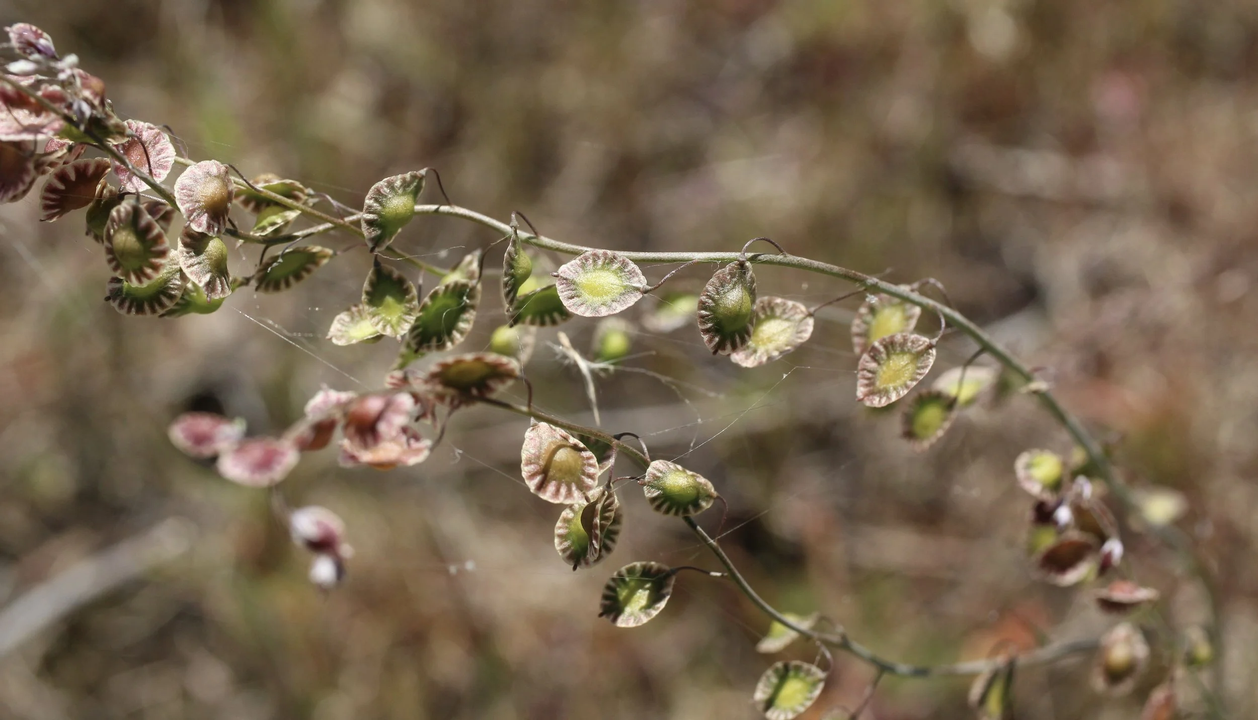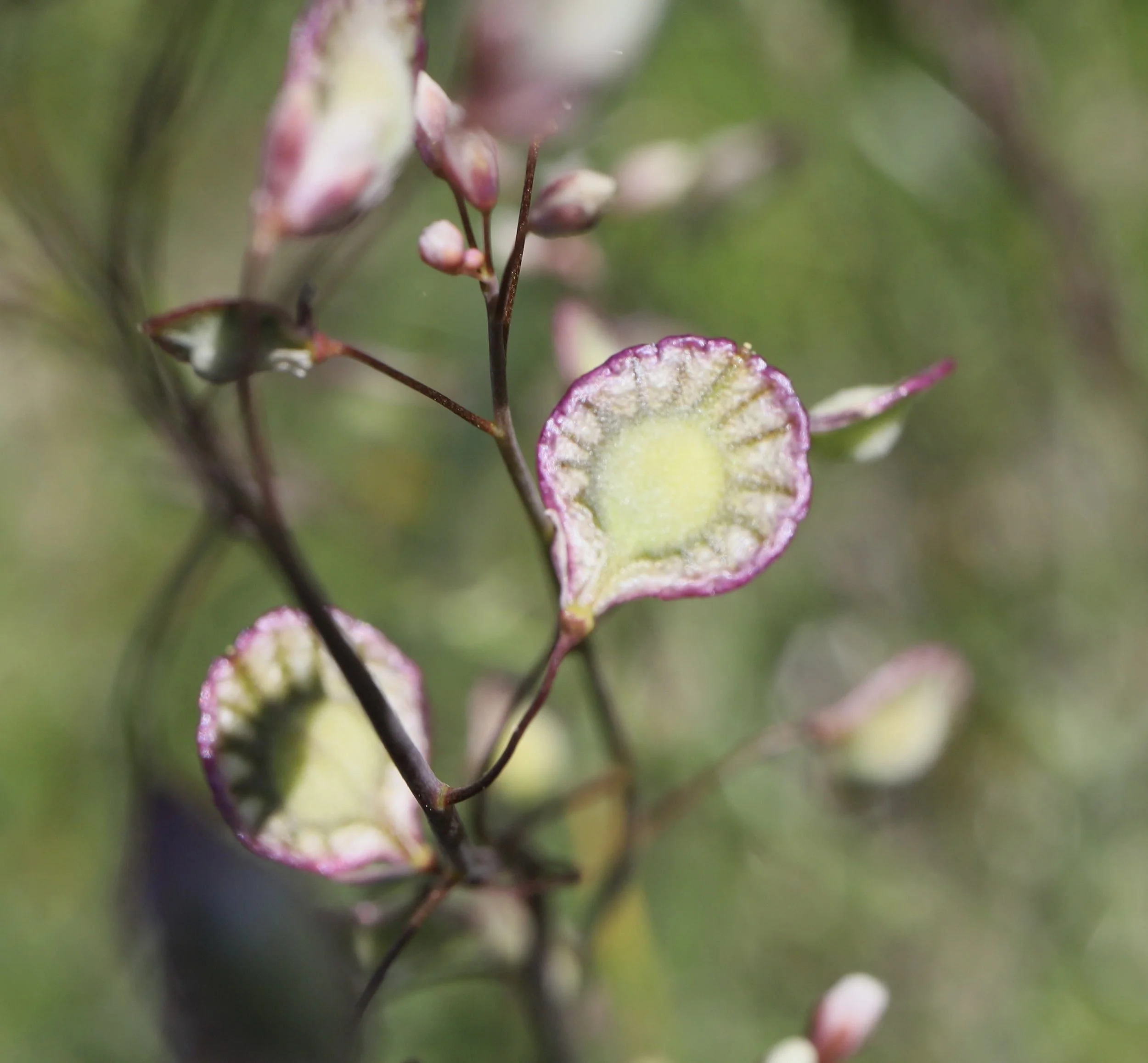This is not really a wildflower, but the seedpod of a small wildflower. I have never seen the actual flower of this erect-stemmed plant. Thysanocarpus curvipes has one seed in each seedpod and has spokes radiating out from the edges of the pod. Thysanocarpus radians is very similar to Thysanocarpus curvipes but has more rounded pods and only grows in Southern Oregon.