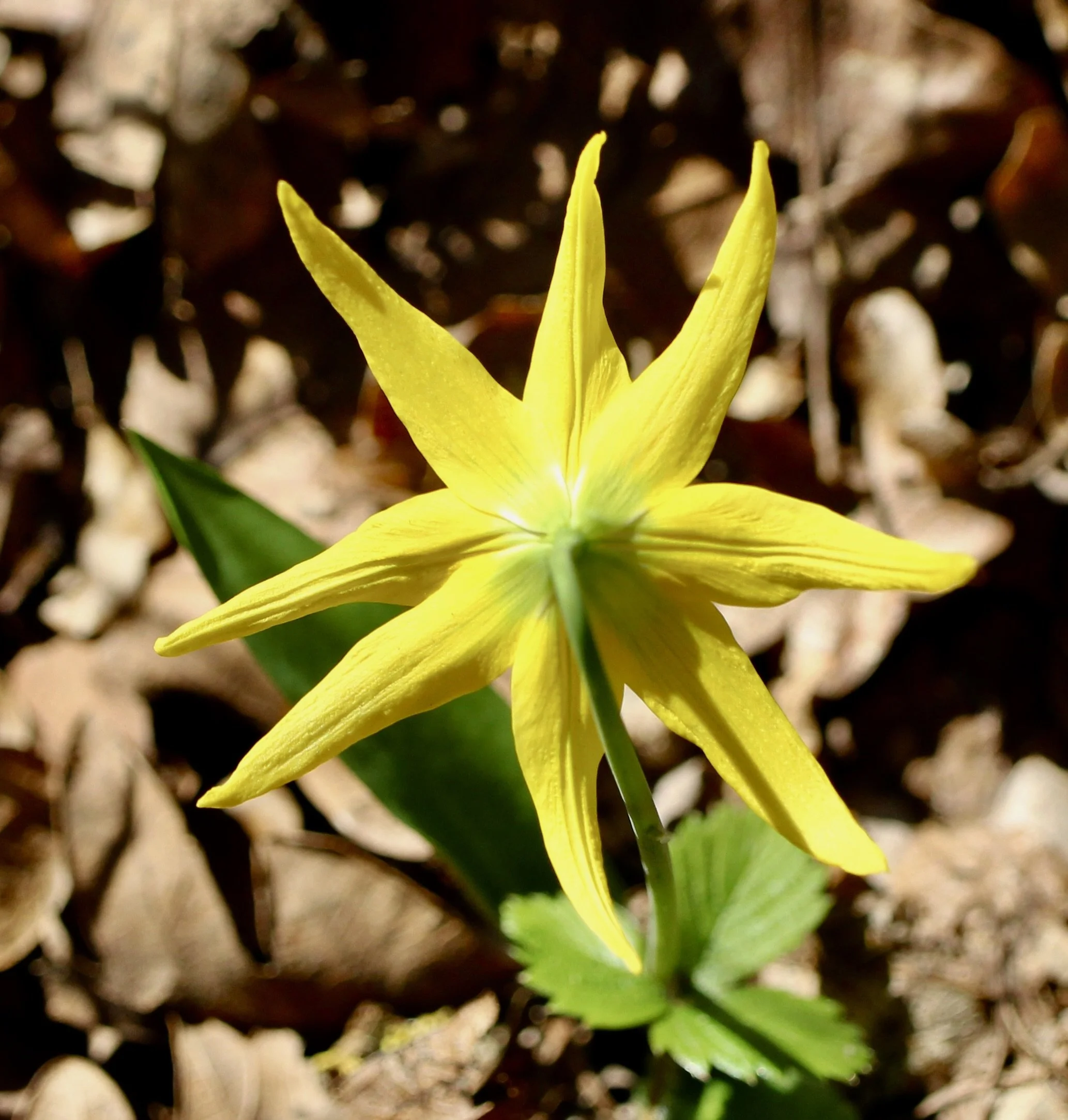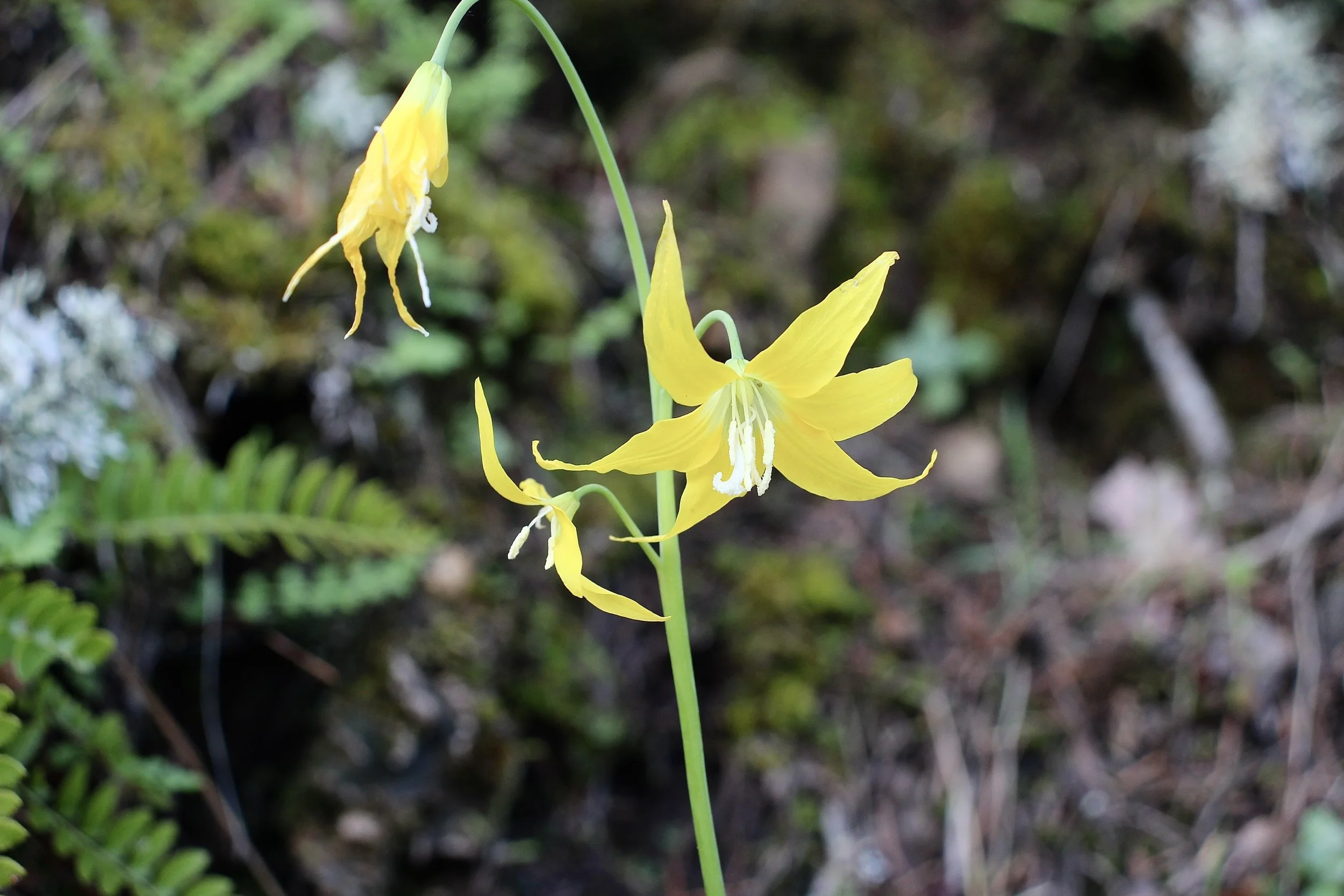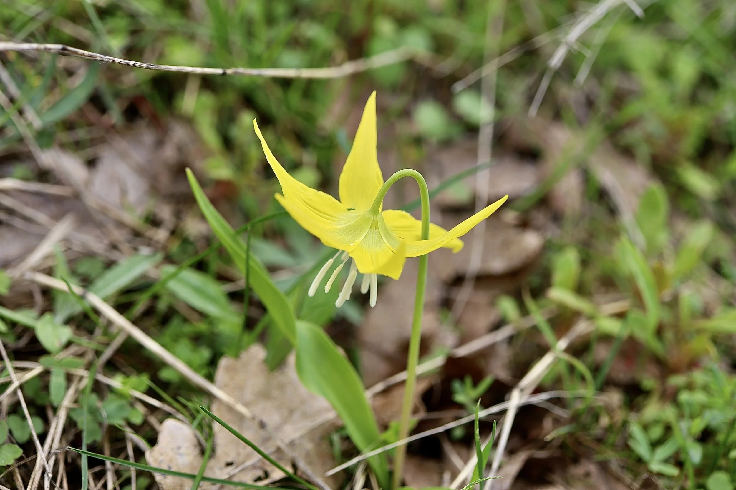 Like many of the lilies, the Glacier Lily hangs facing down. The stamens and pistil hang below the petals which curve back up. In the spring these will be some of the earliest wildflowers to show up.