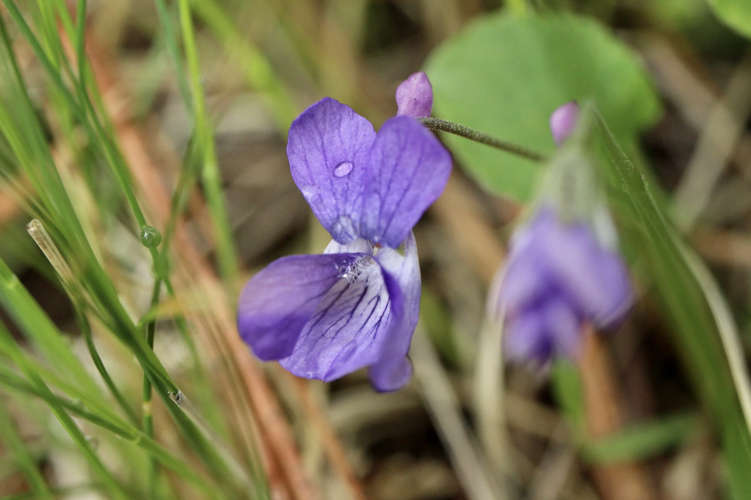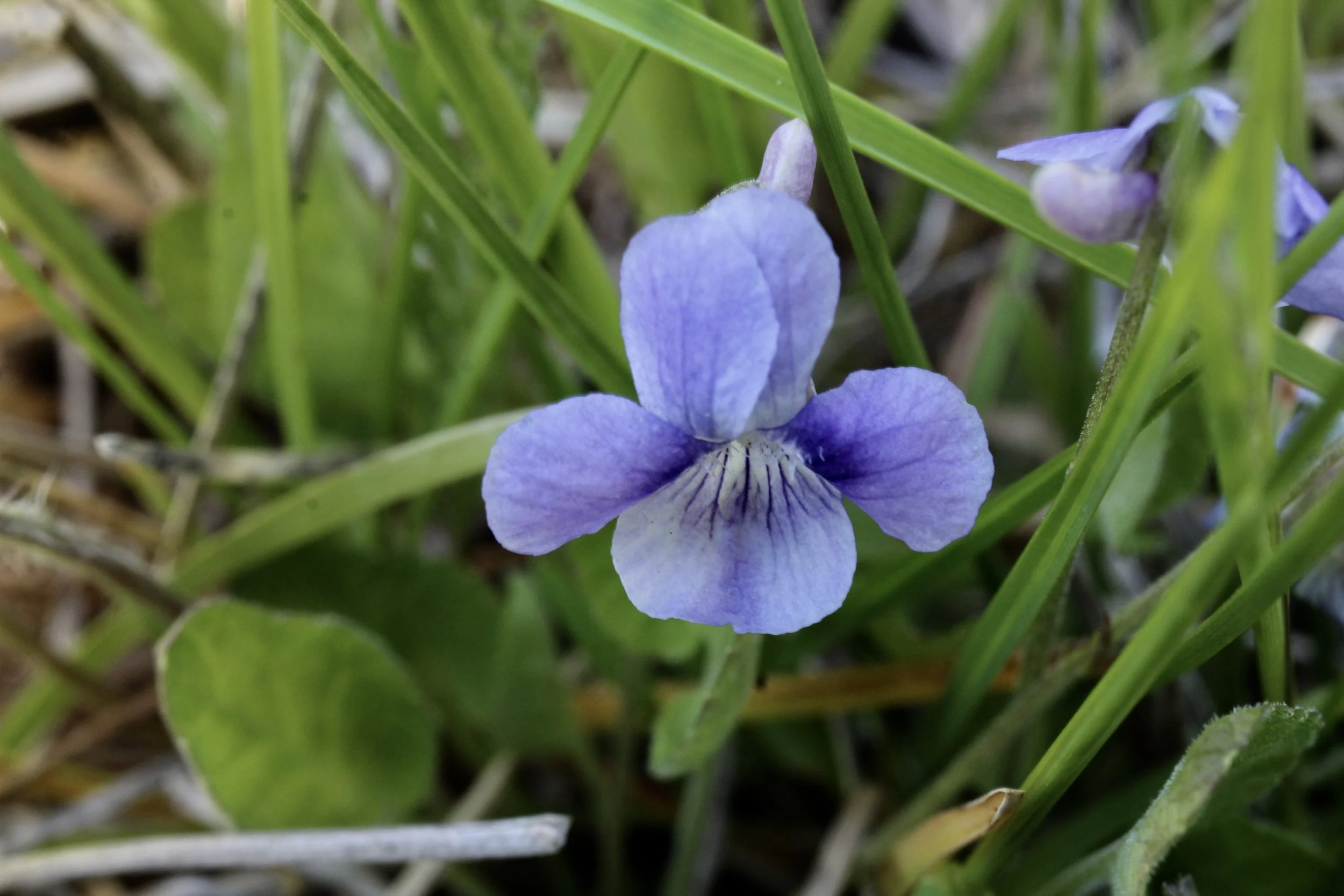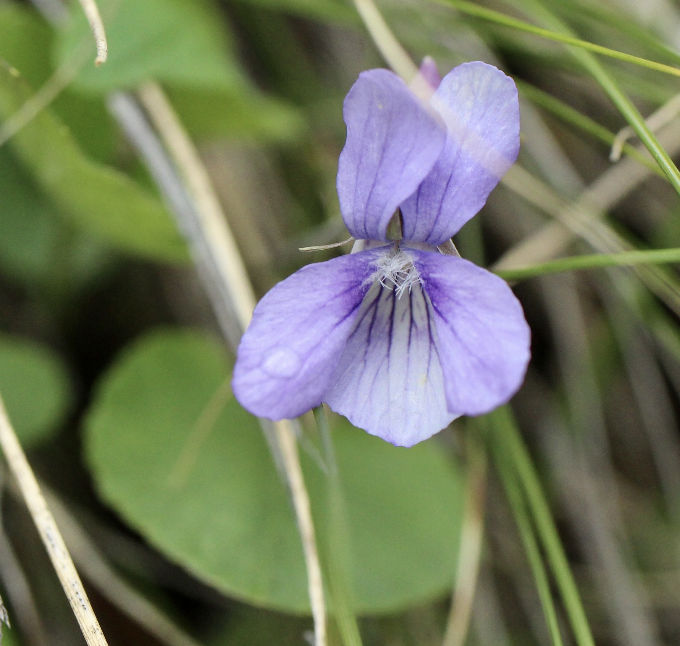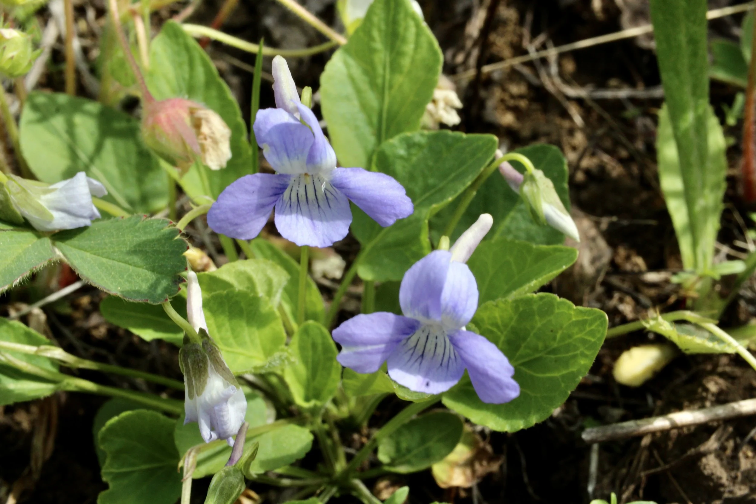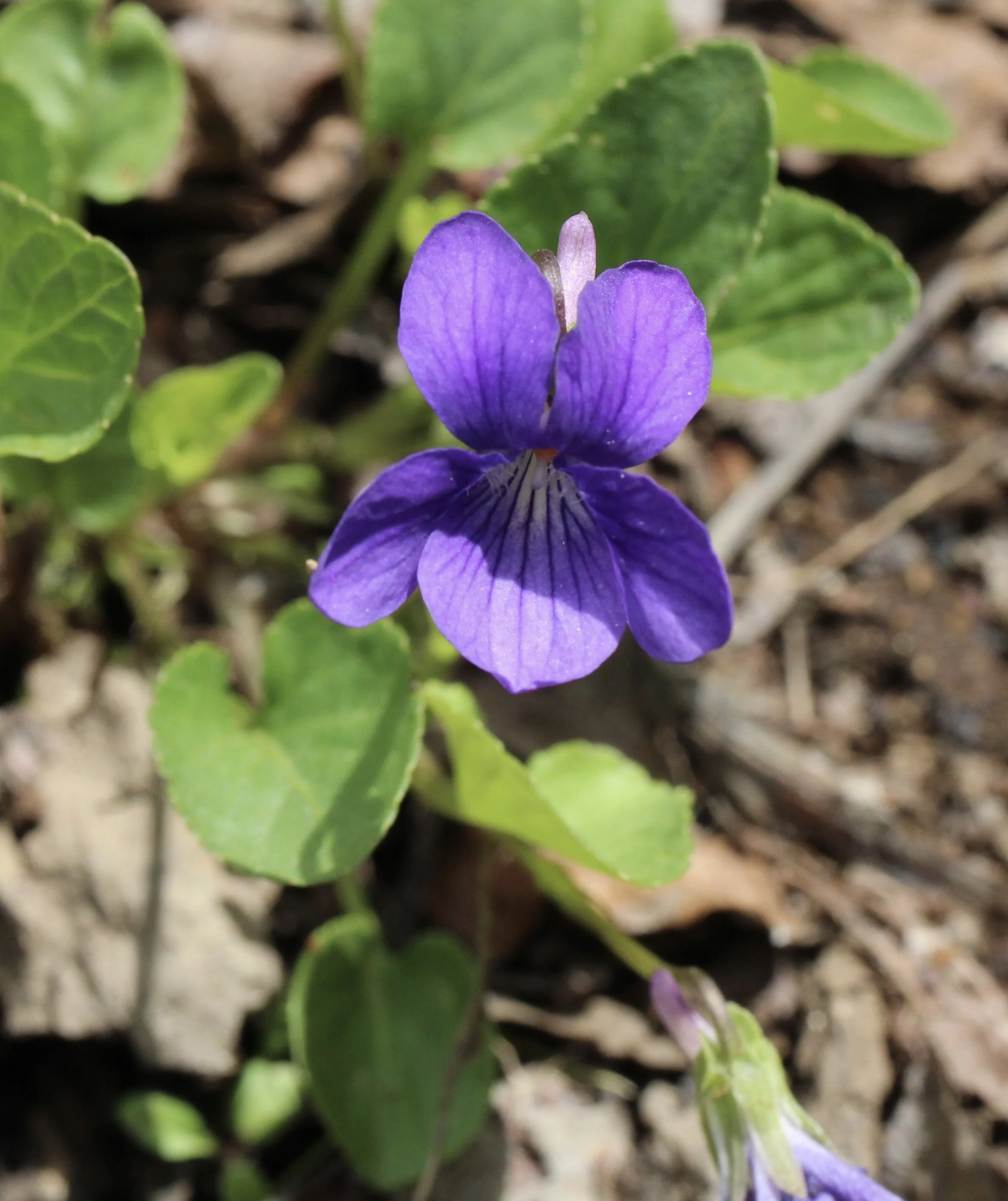 The Hookedspur Violet has rounded leaves in patches, with the flowers growing from this patch. Each flower has a spur at the rear of the petals, and a white base with white beards. Sometimes this wildflower is called the Early Blue or Long-spurred Violet.