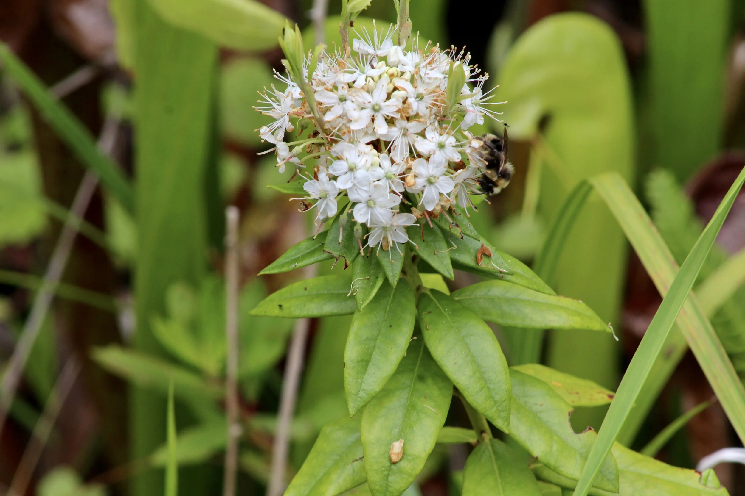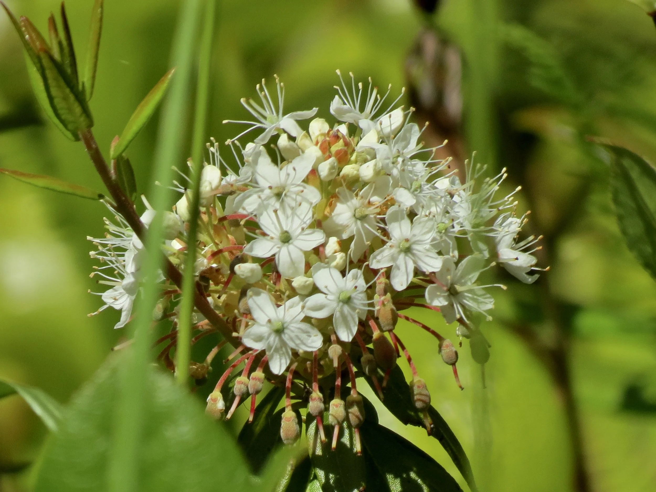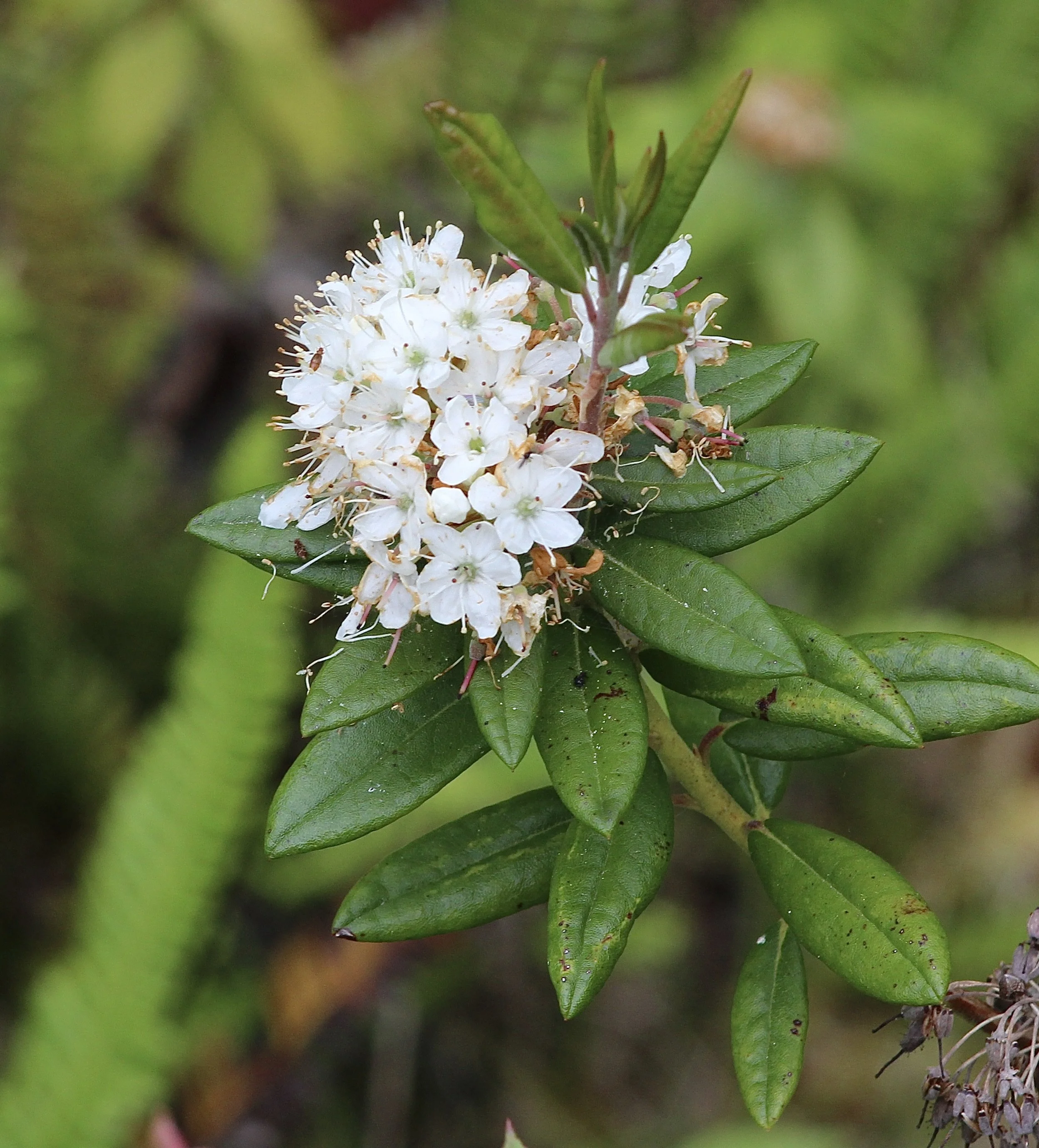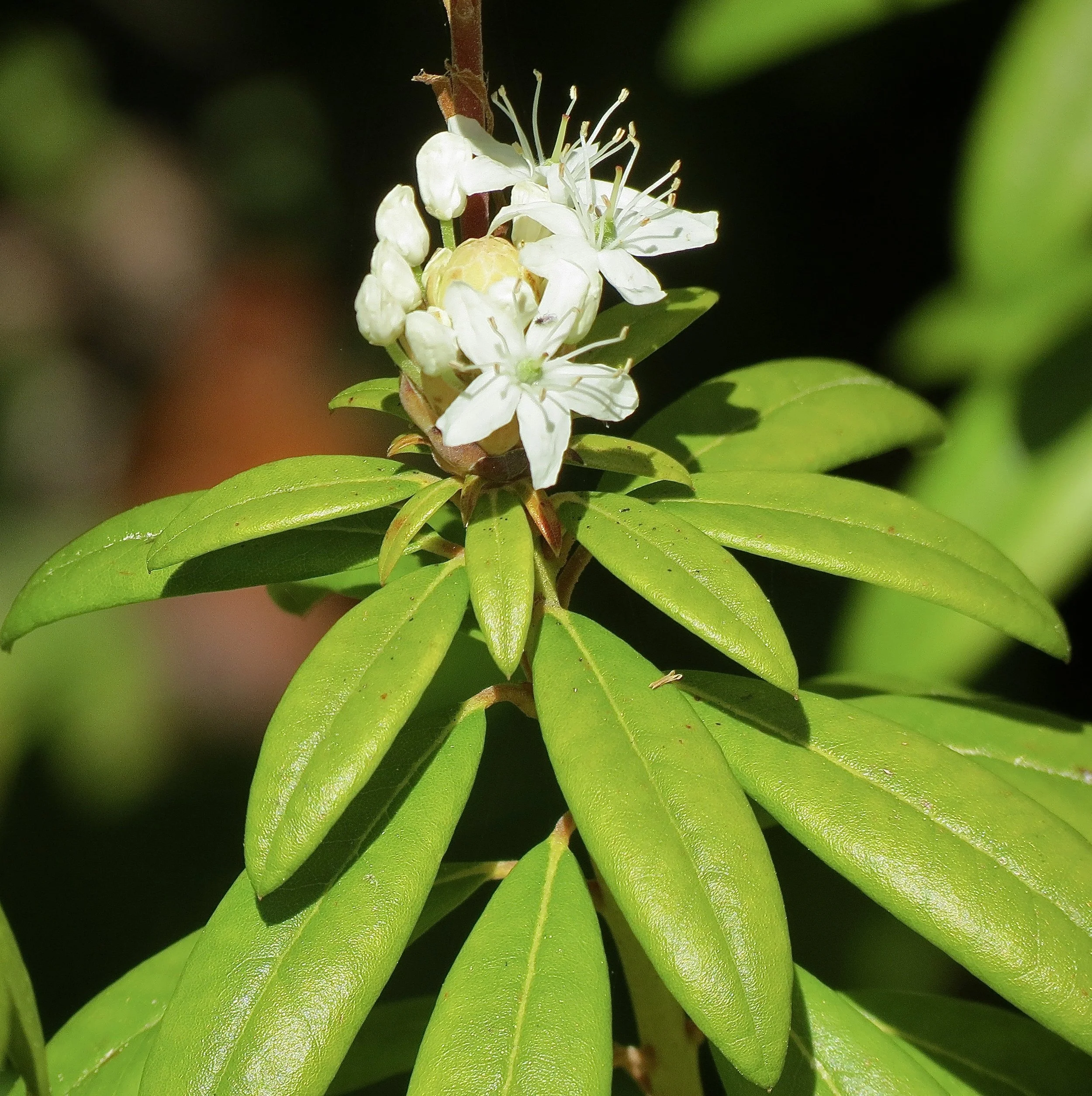 Always found growing near swampy, boggy areas, Labrador Tea is a relative of the Rhododendron. The white flowers have five petals and the stamens extend beyond the petals. This is an evergreen shrub. The undersides of the leaves turn brown as they age.