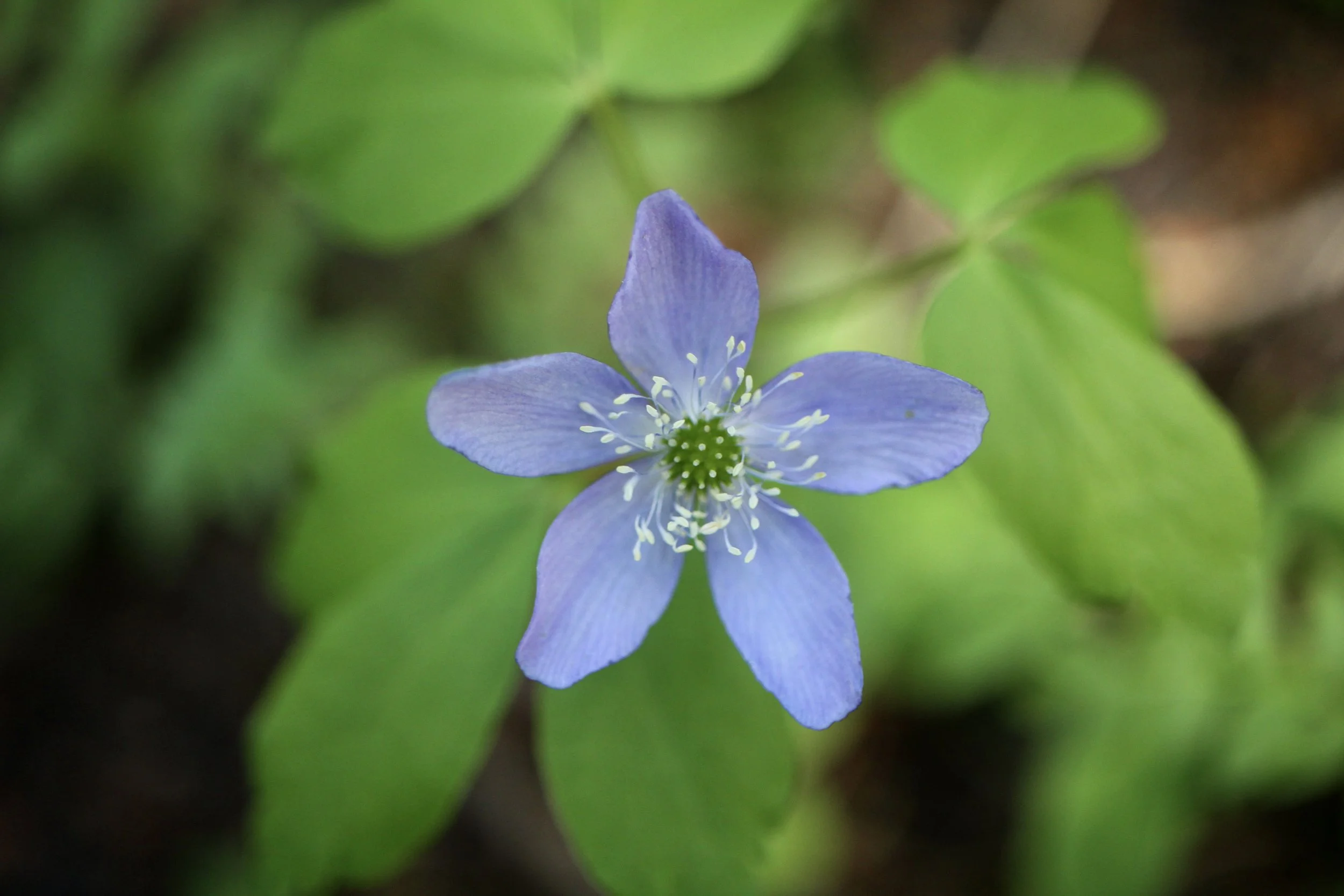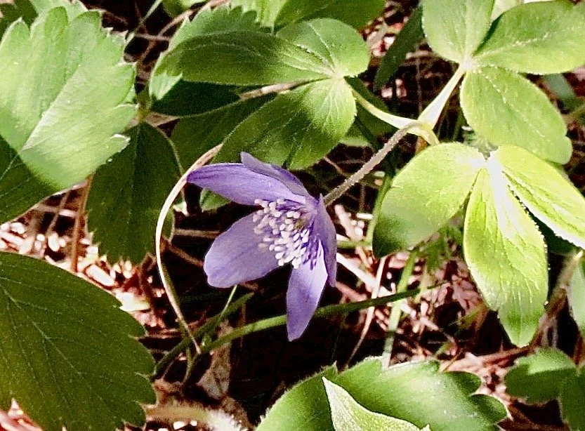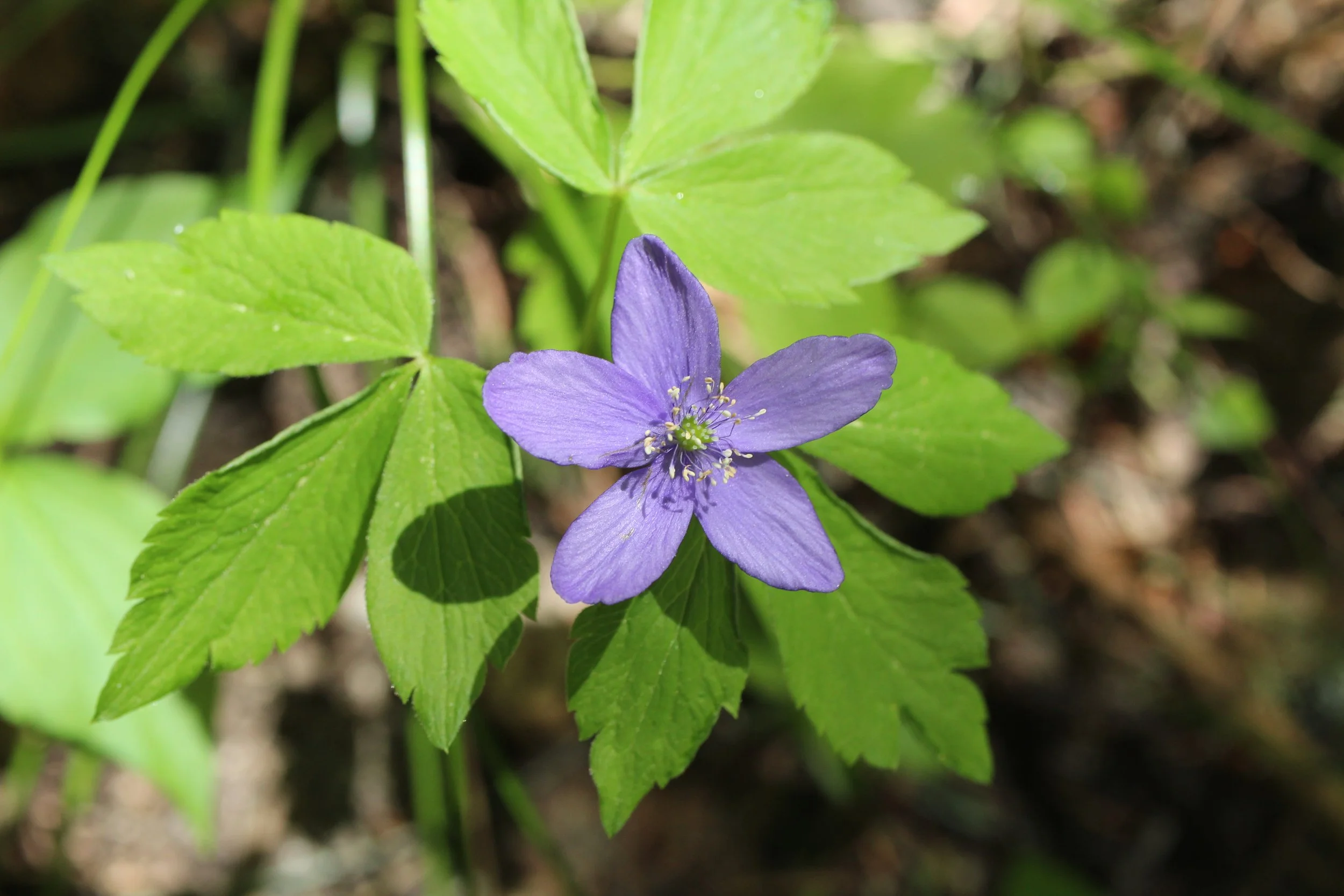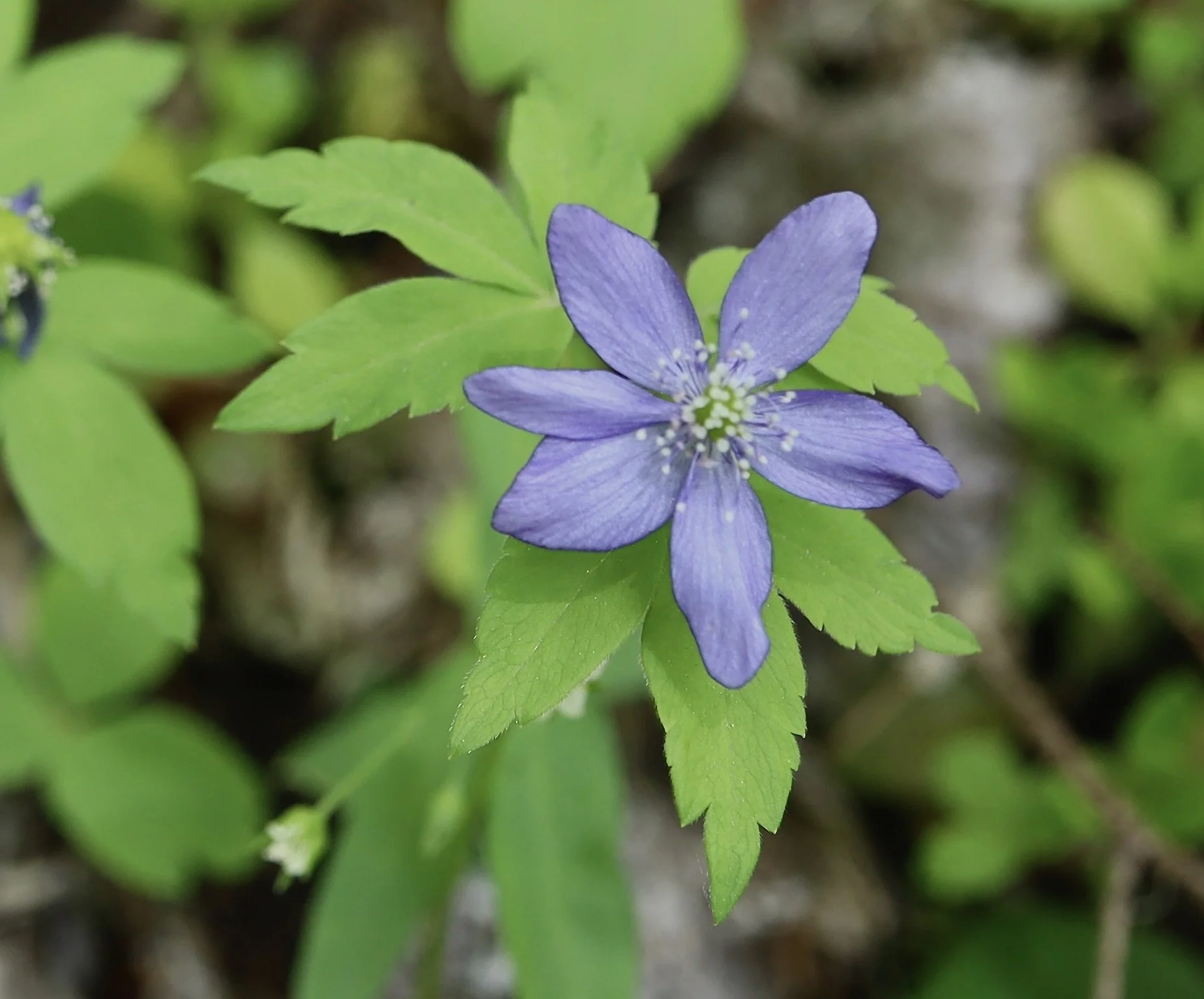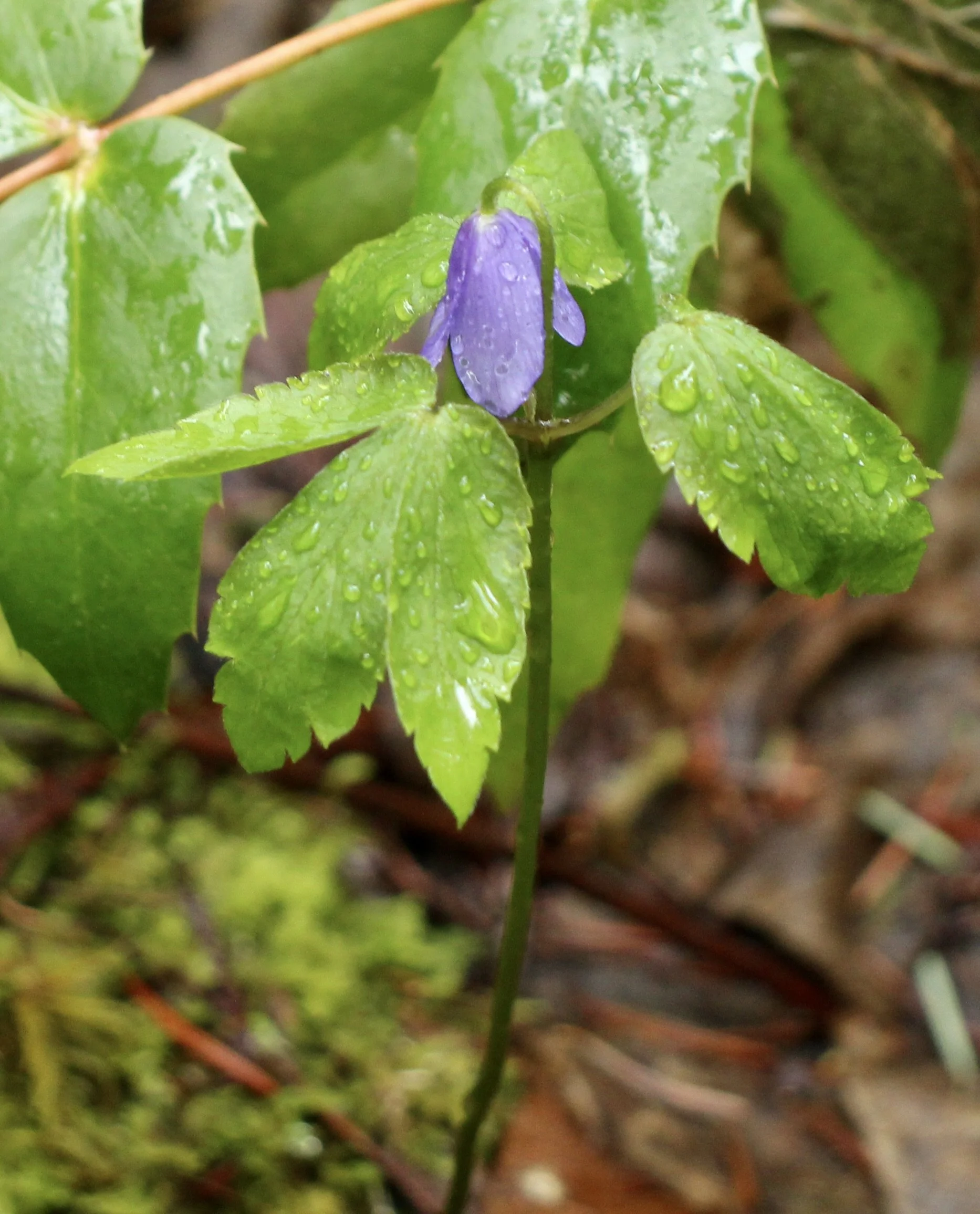 Growing in moist, rich forests, the Oregon Anemone is very similar to the Columbia Windflower. The biggest difference is that the Oregon Anemone has blue to light purple flowers, whereas the Columbia Windflower has white flowers. There are often over thirty-five stamens, all with white tipped anthers. The leaves are deltoid and toothed.