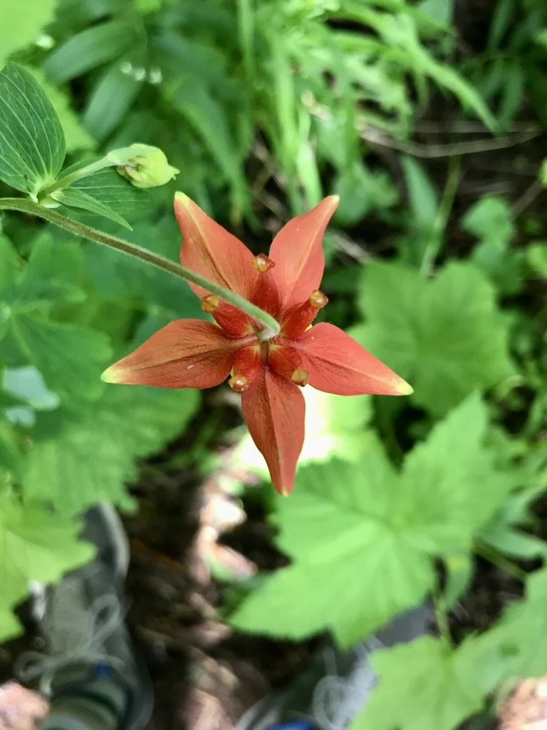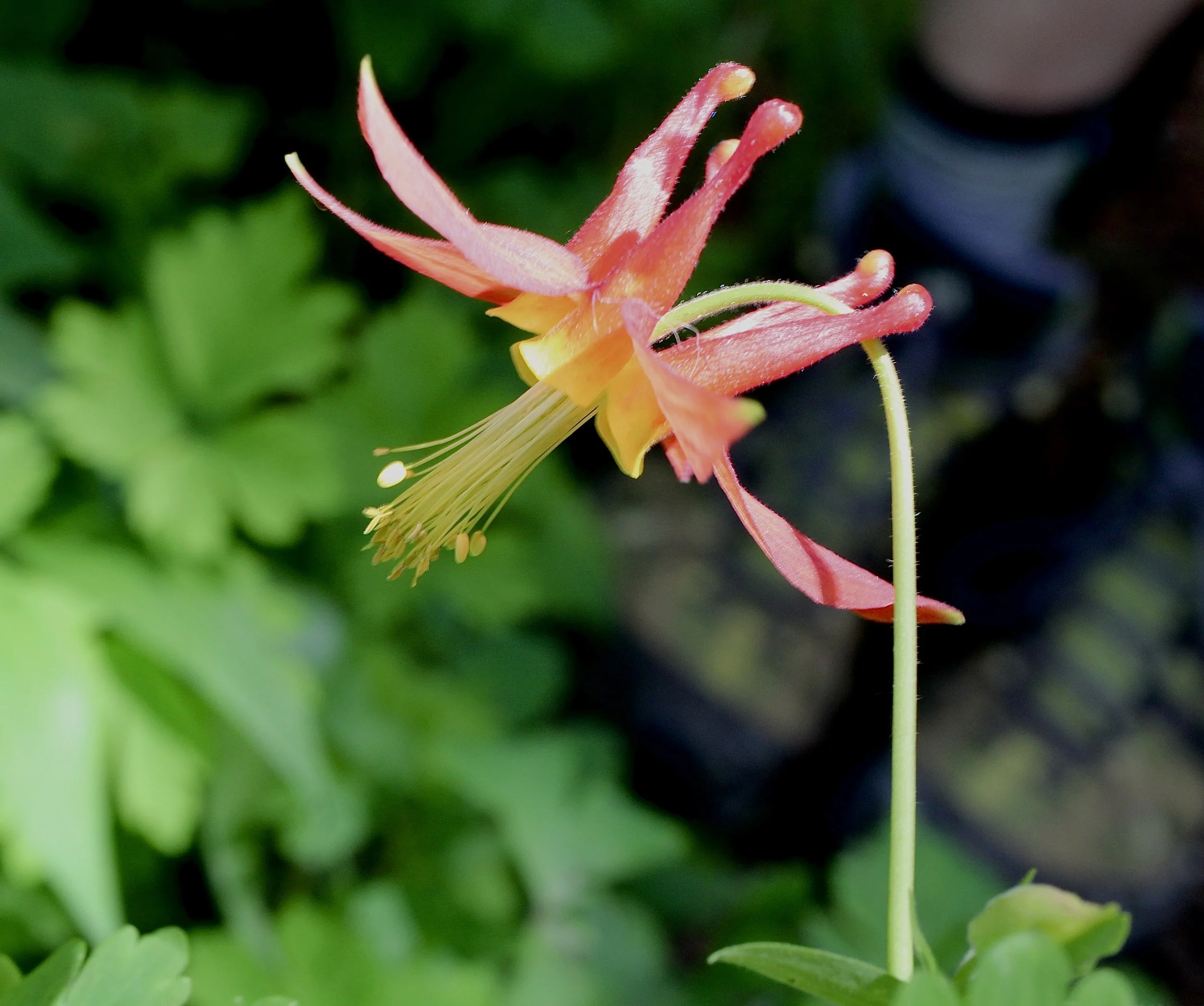 The Red Columbine lives in moist areas with partial shade. They can grow over three feet tall. Each leaf has three parts which are again divided into three parts. The bright red and yellow flower has spurs that point up while the rest of the flower faces down with the stamens and stiles hanging from the center and dangling below the flower.