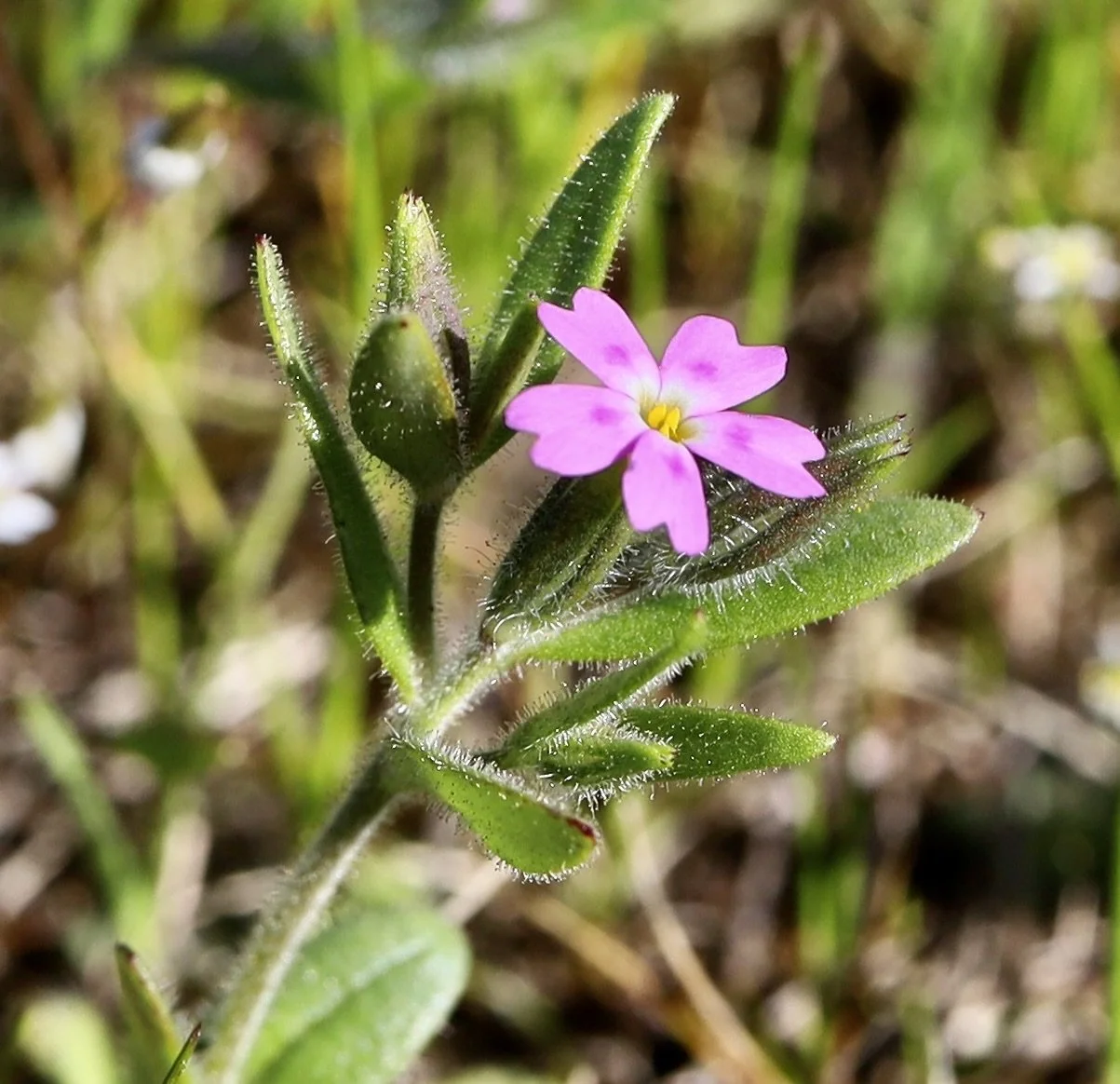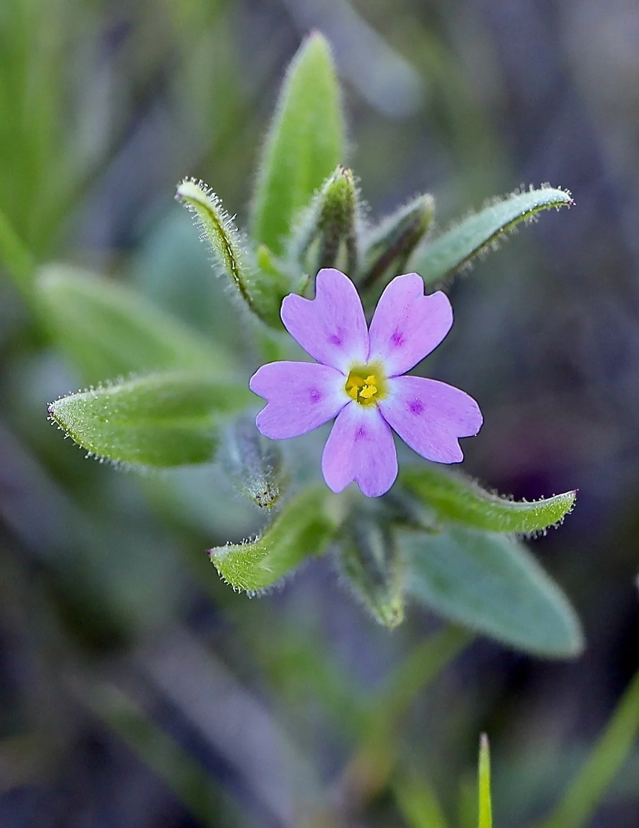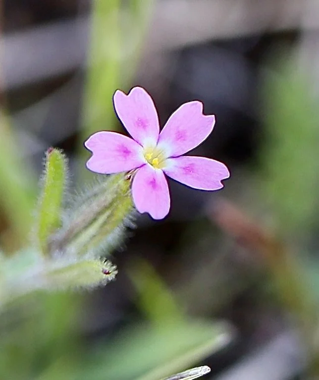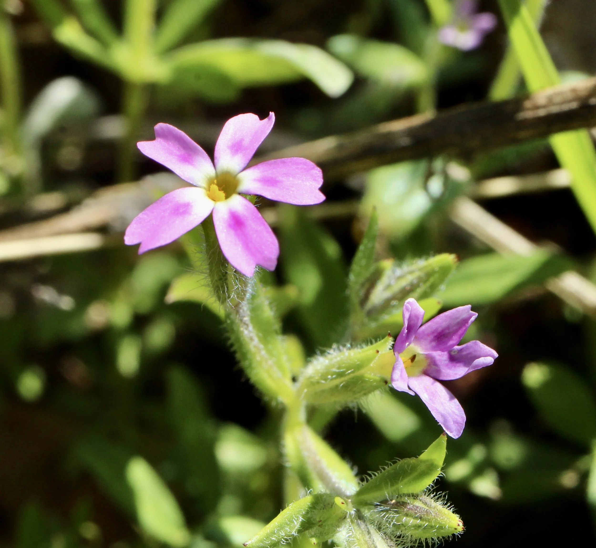 Slender Phlox is sometimes called Midget Phlox. Each of the five petals of the flower are lobed at the end, often with a small splotch of deeper color in the middle of the petal. The tube of the flowers is white. The leaves are oblong and hairy.