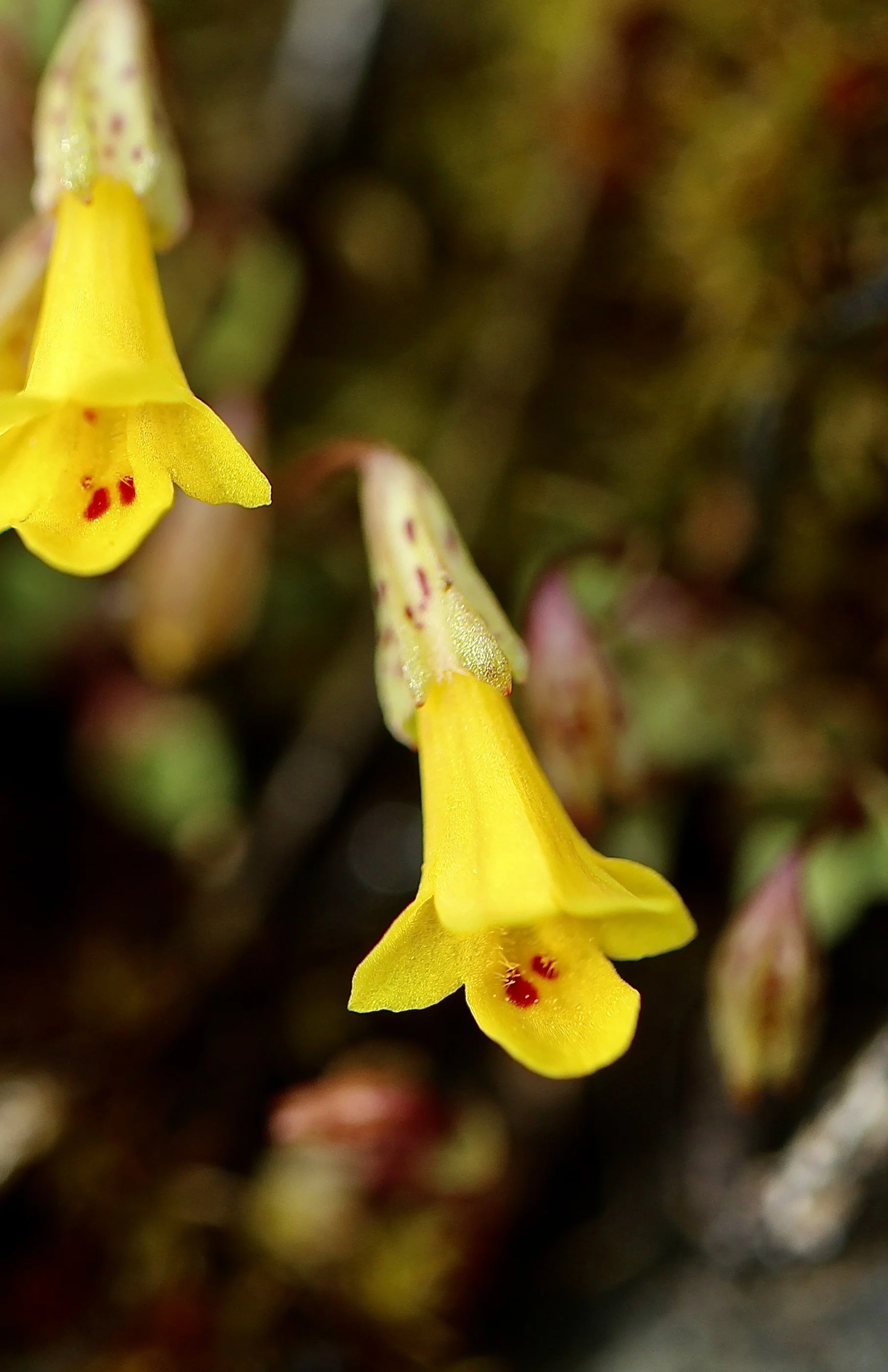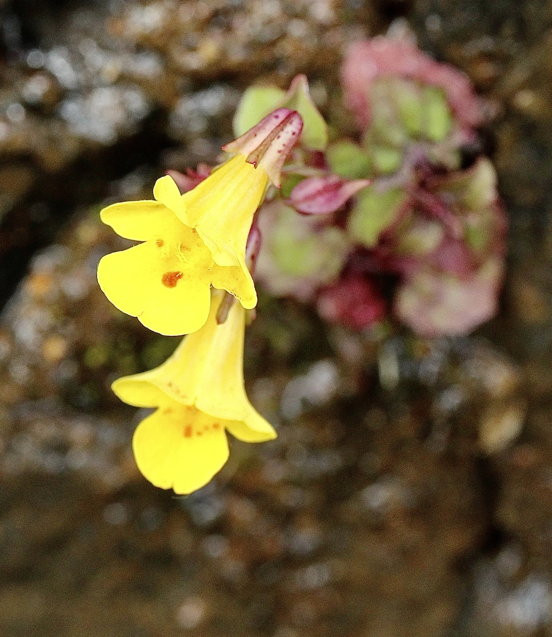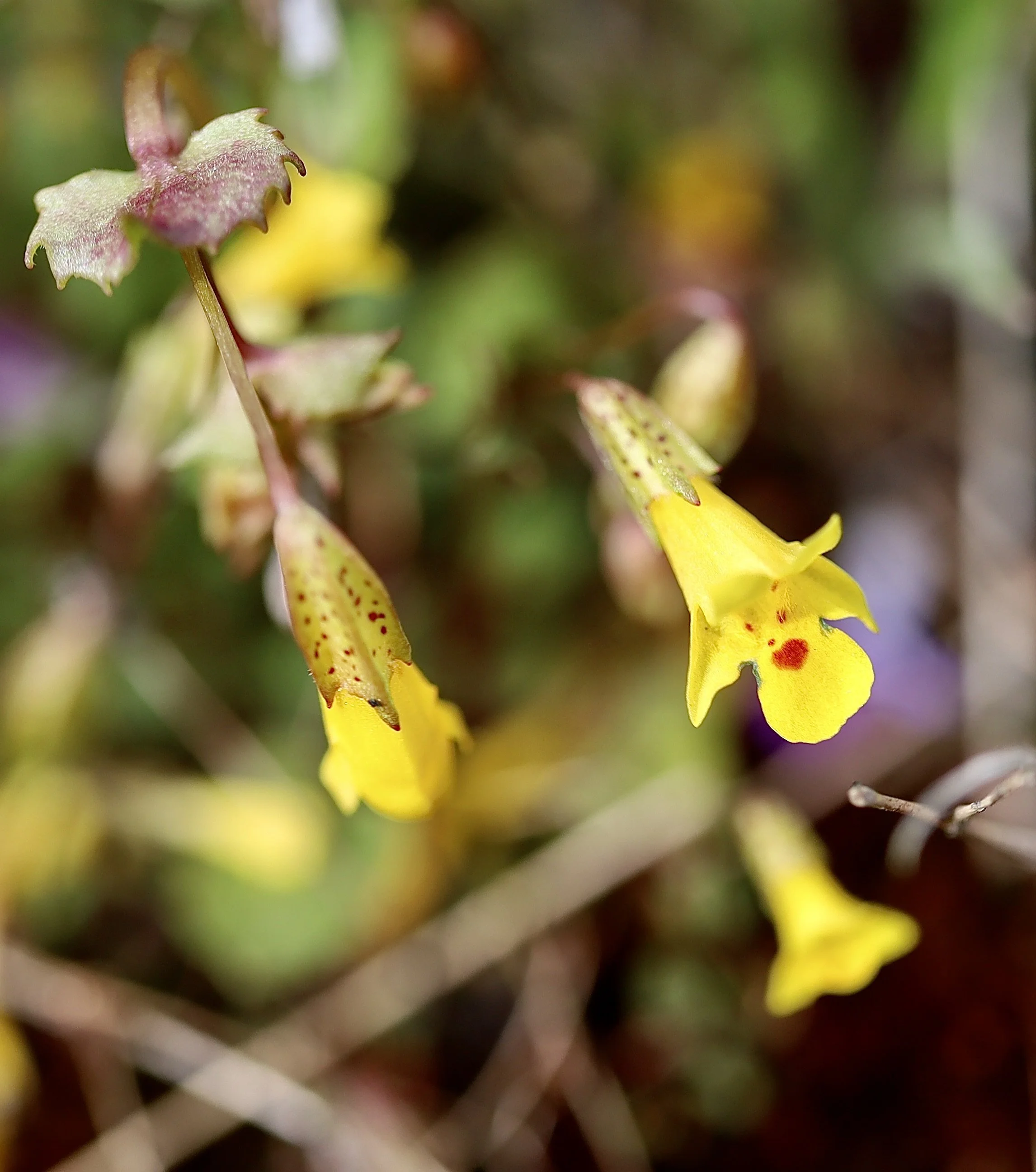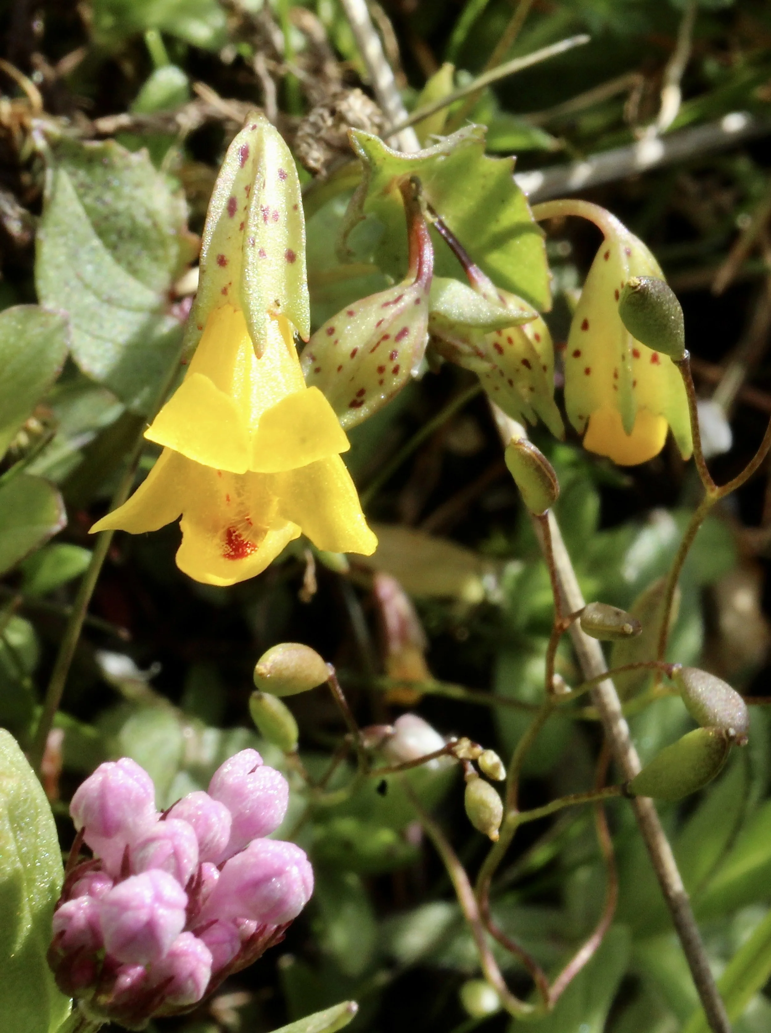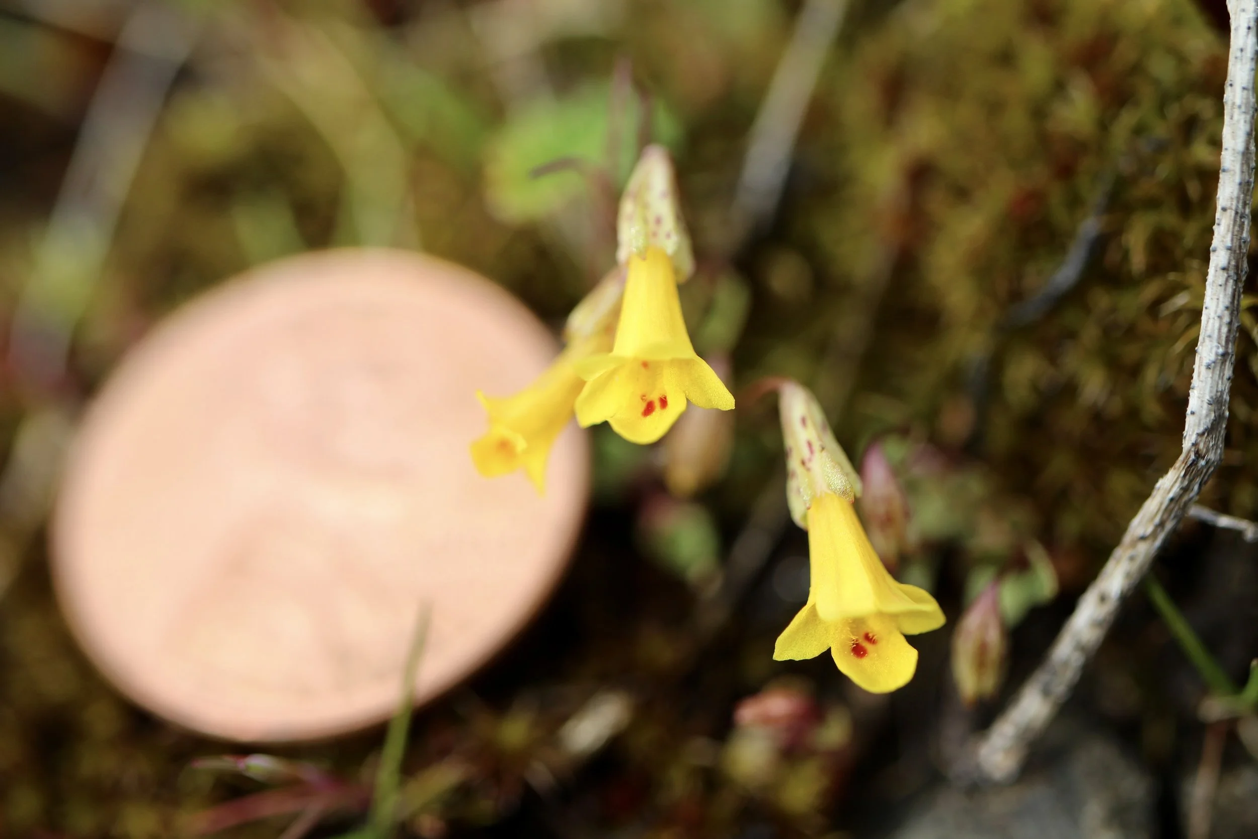 One more tiny wildflower: the Small-leaf Monkeyflower lives at streamside and damp areas on rocky soil. It is tiny for a monkeyflower; see the photo below with the hard-to-make-out penny for size comparison. Like many other monkeyflowers, there are many red splotches on the lower lip of the flower. The calyx has red dots on it also.