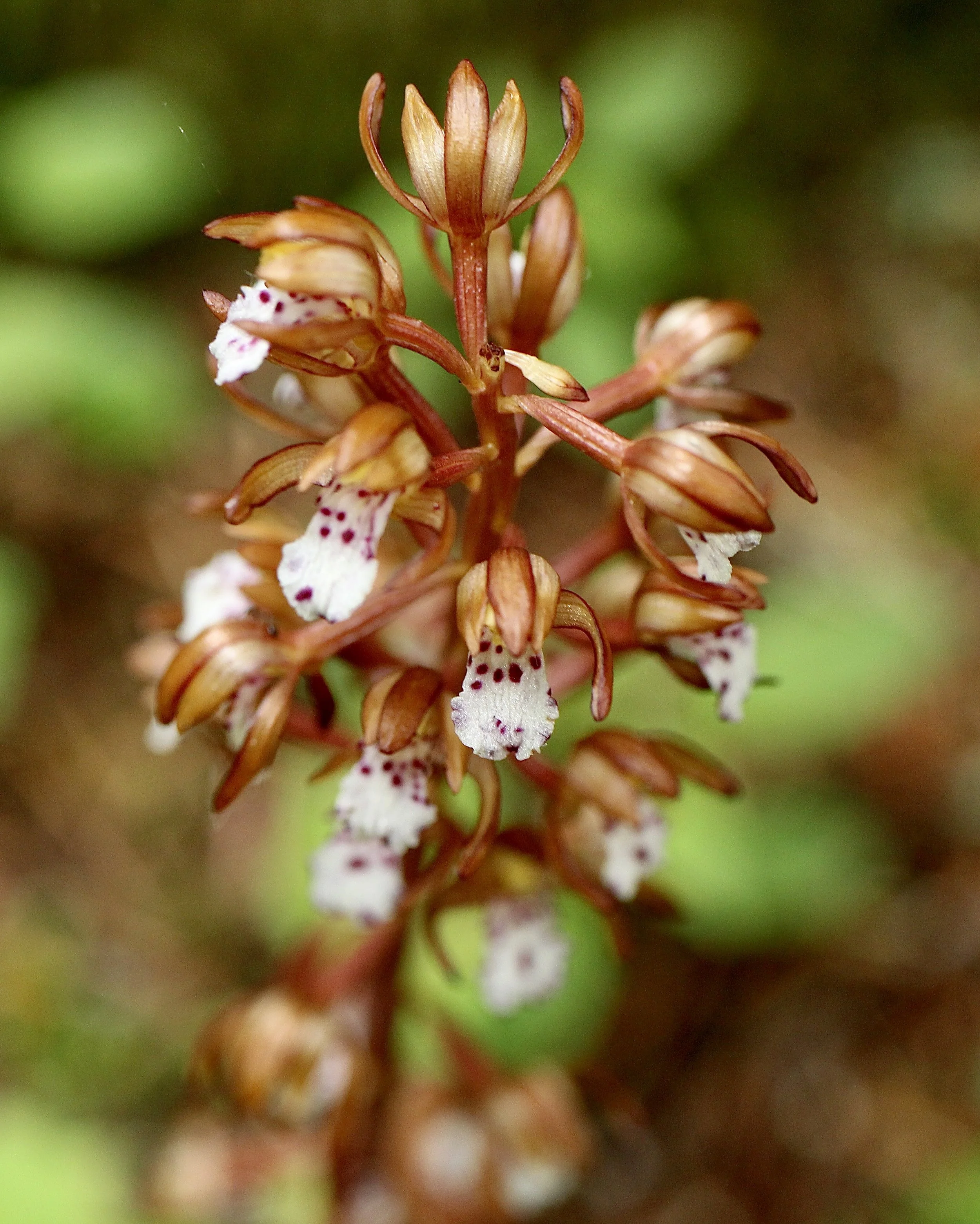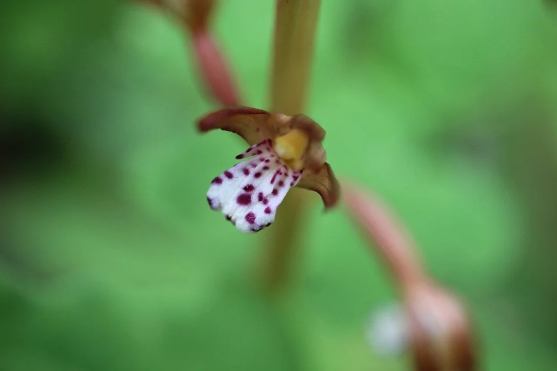 Another orchid family member, the Spotted Coralroot and get to a little over a foot tall. The flowers are distinct with purple spots on the bottom petal. There are many flowers on each stalk. As with most of these myco-heterotrophic wildflowers, the Spotted Coralroot grows from the forest floor.