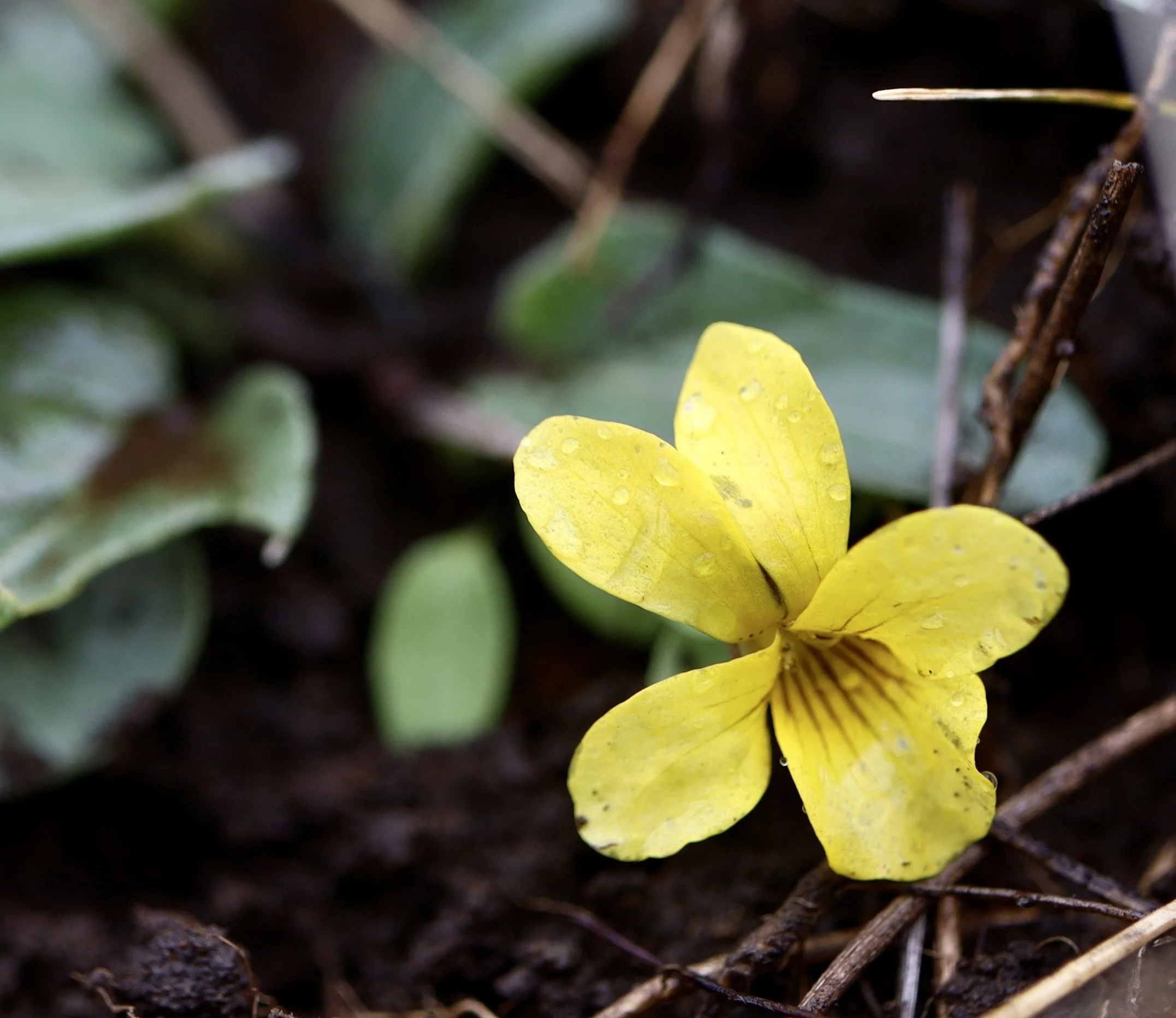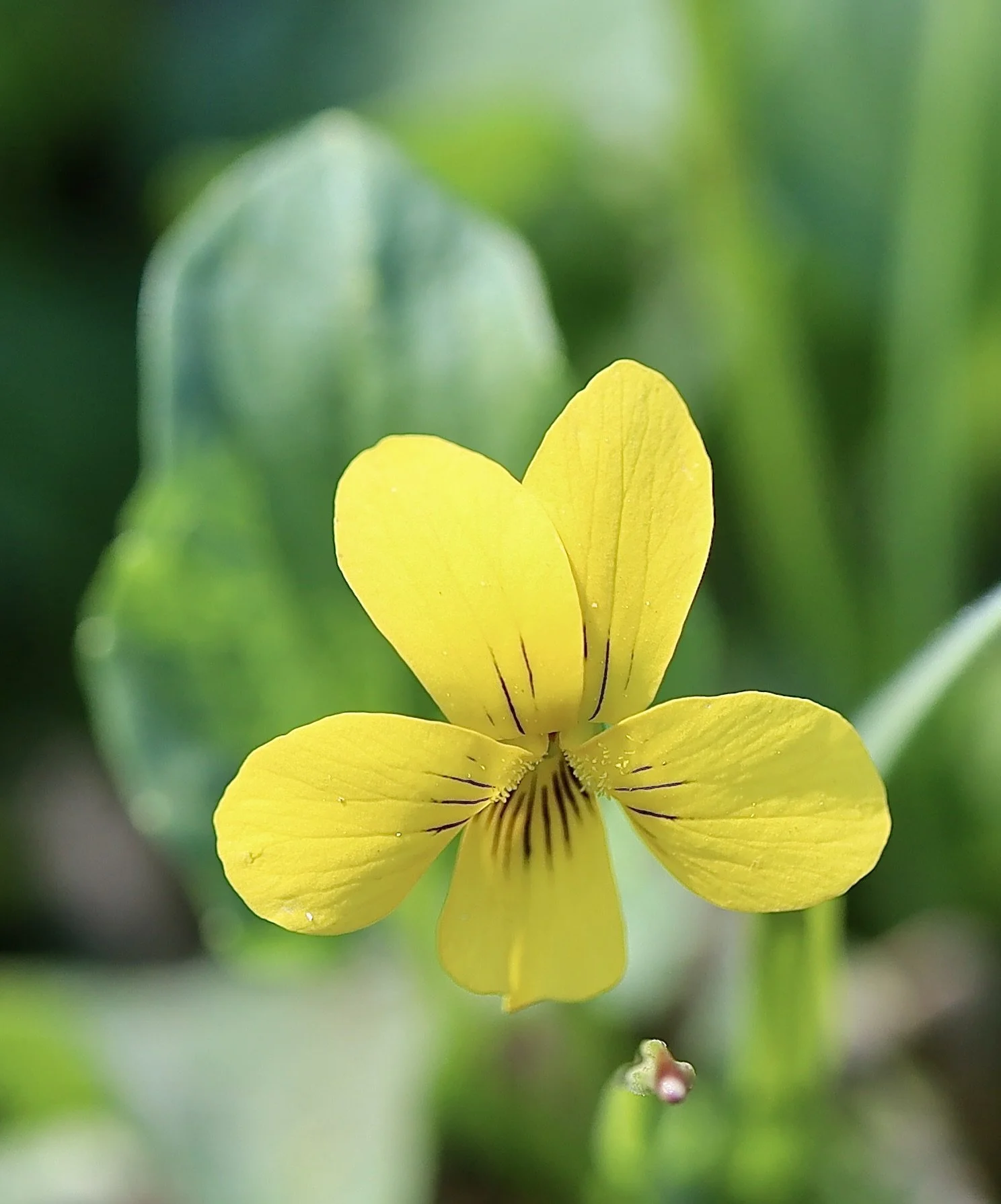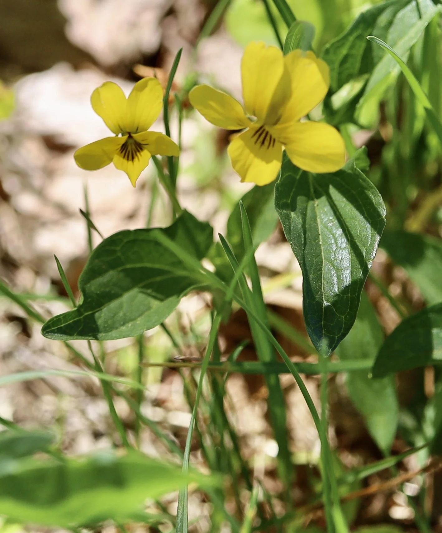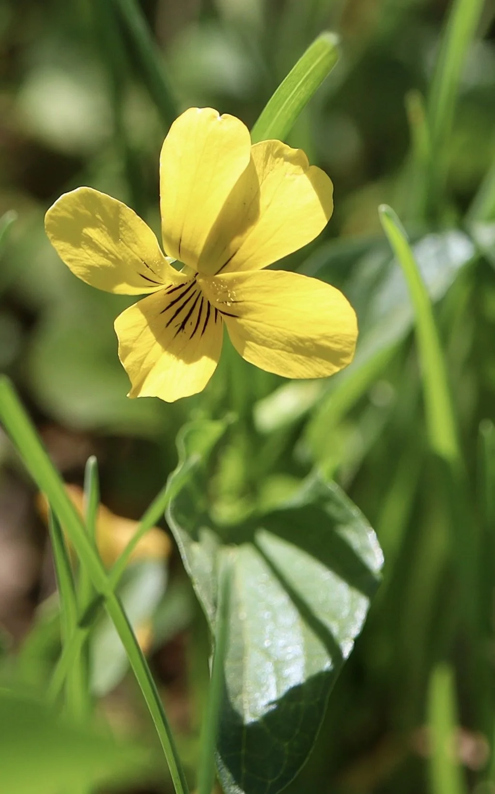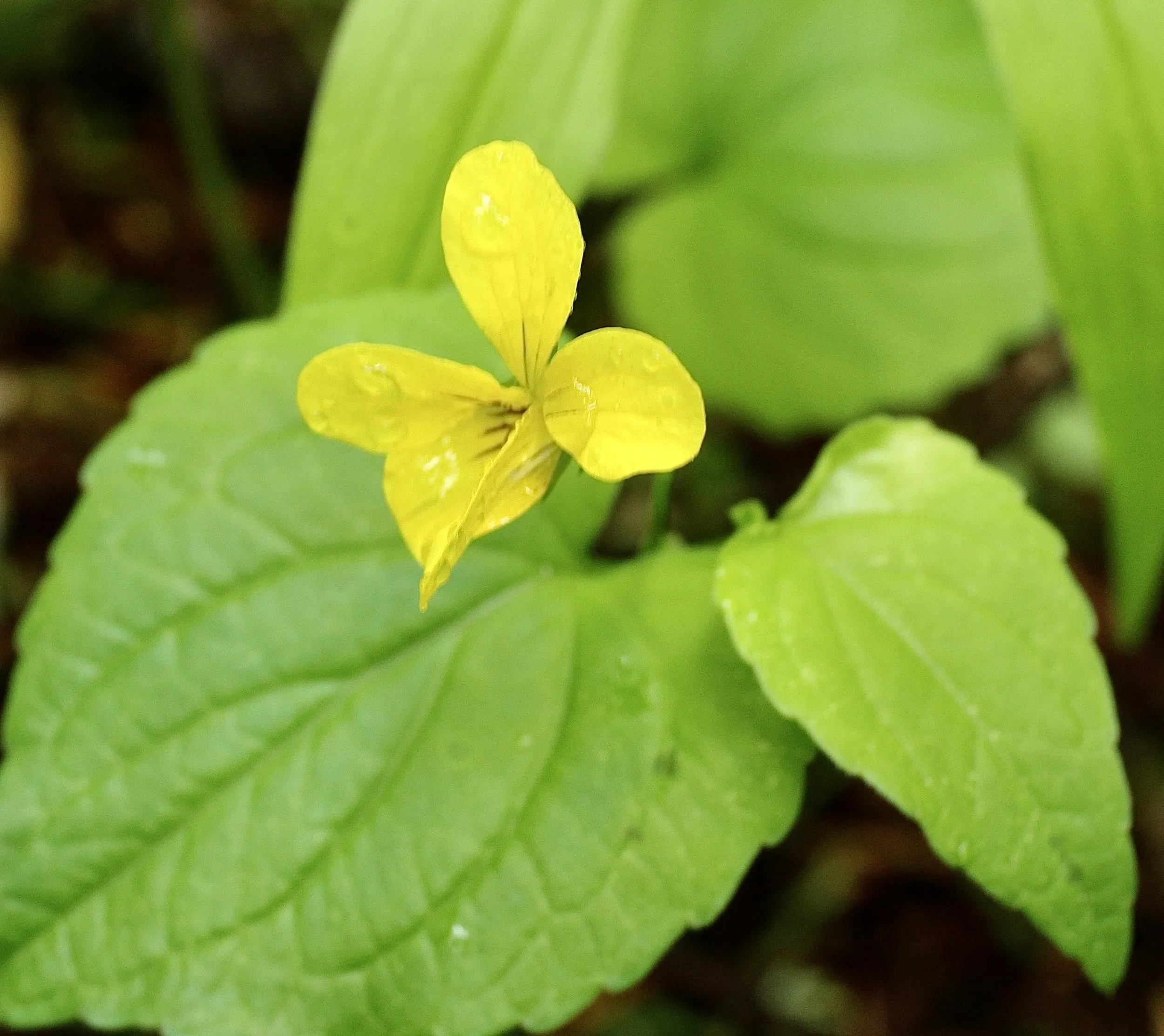 Often growing next to streambanks, or in moist forests, the Stream or Smooth Yellow violet has heart-shaped leaves that taper to a point. The bright yellow flowers have five petals, the lower three petals have dark purple stripes on them.