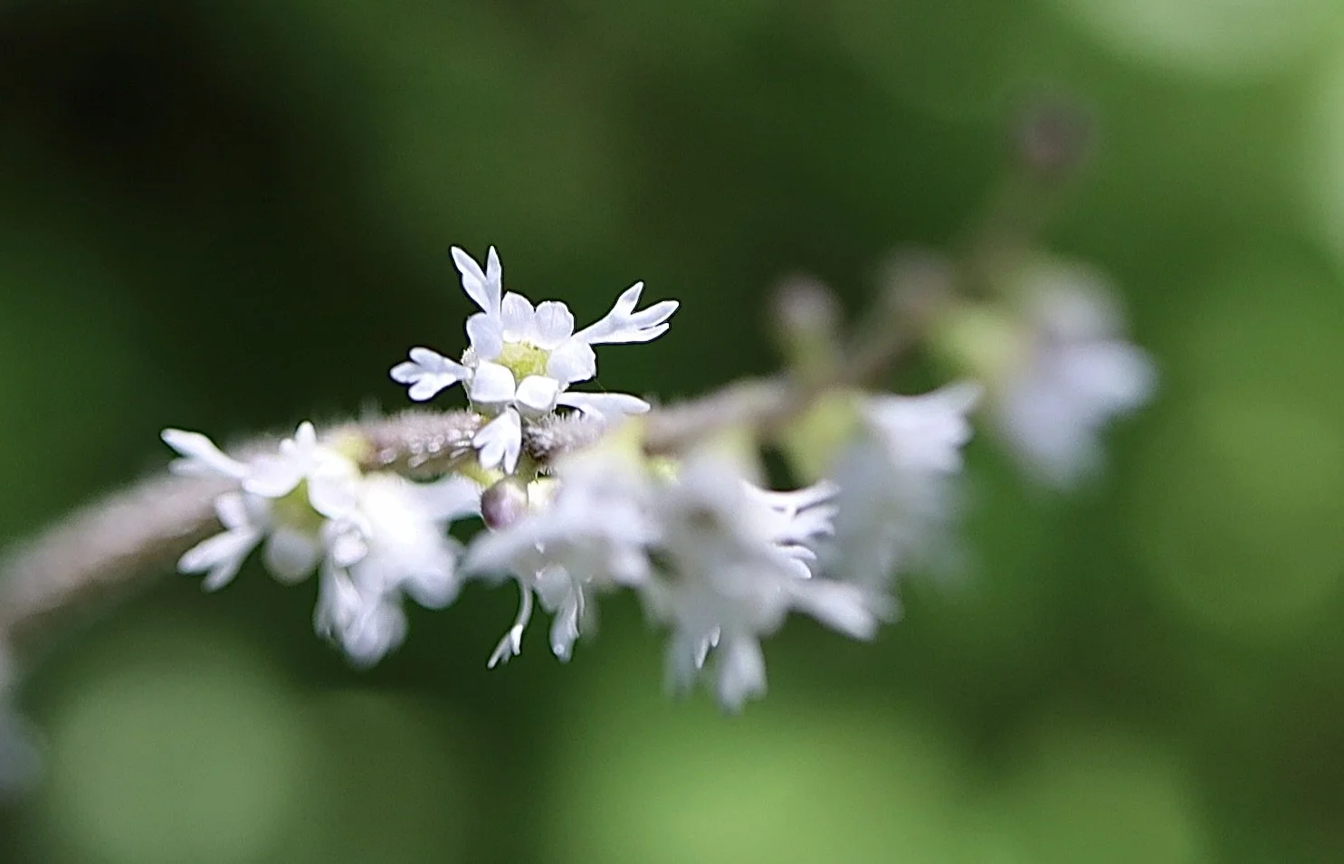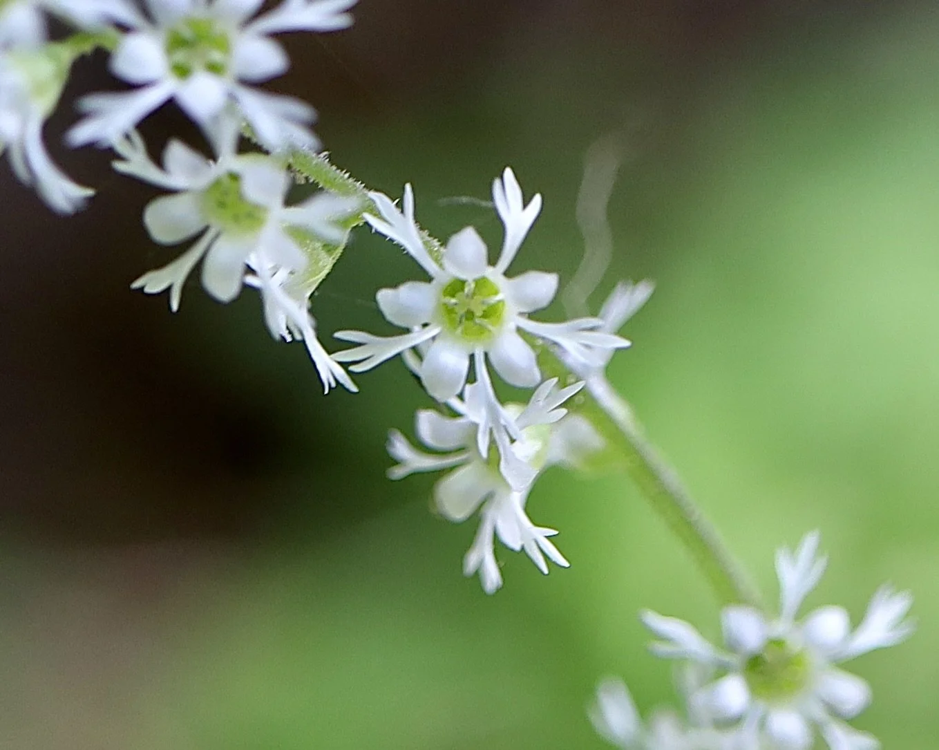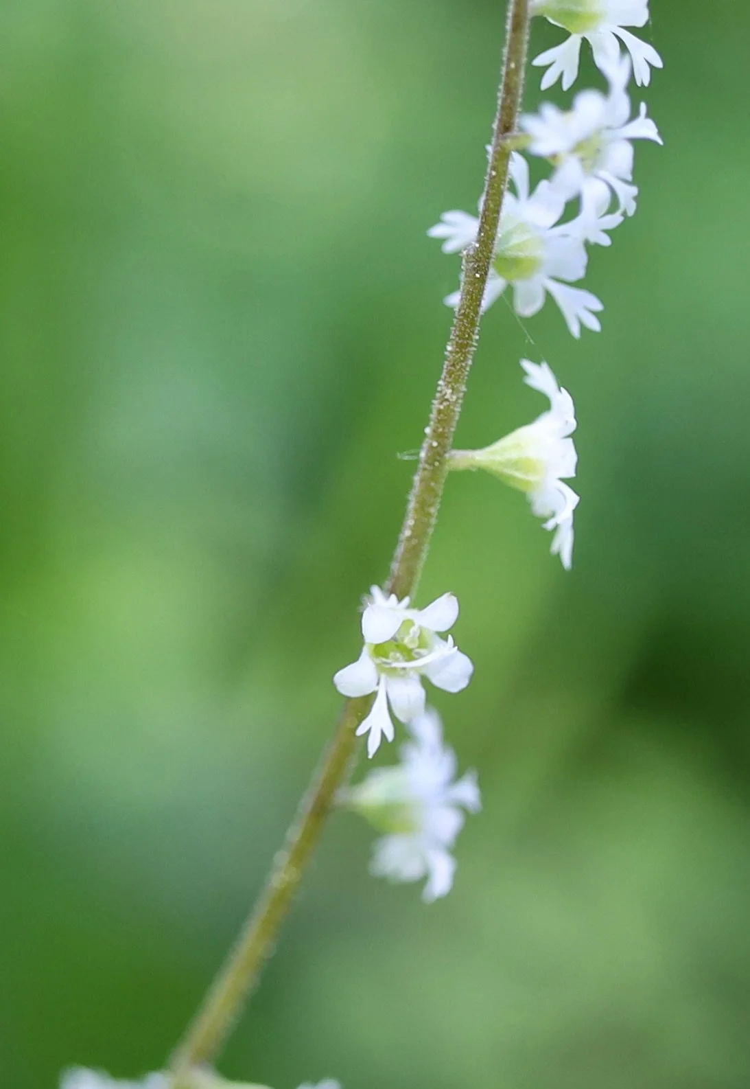 The leaves of the Three-toothed Mitrewort are heart-shaped and low to the ground. There are no leaves going up the stem of this wildflower. The flowers are all on one side of the stem; have five petals with lobes with the characteristic trident shape. There are five stamens that are short and inside the cup of the flower.