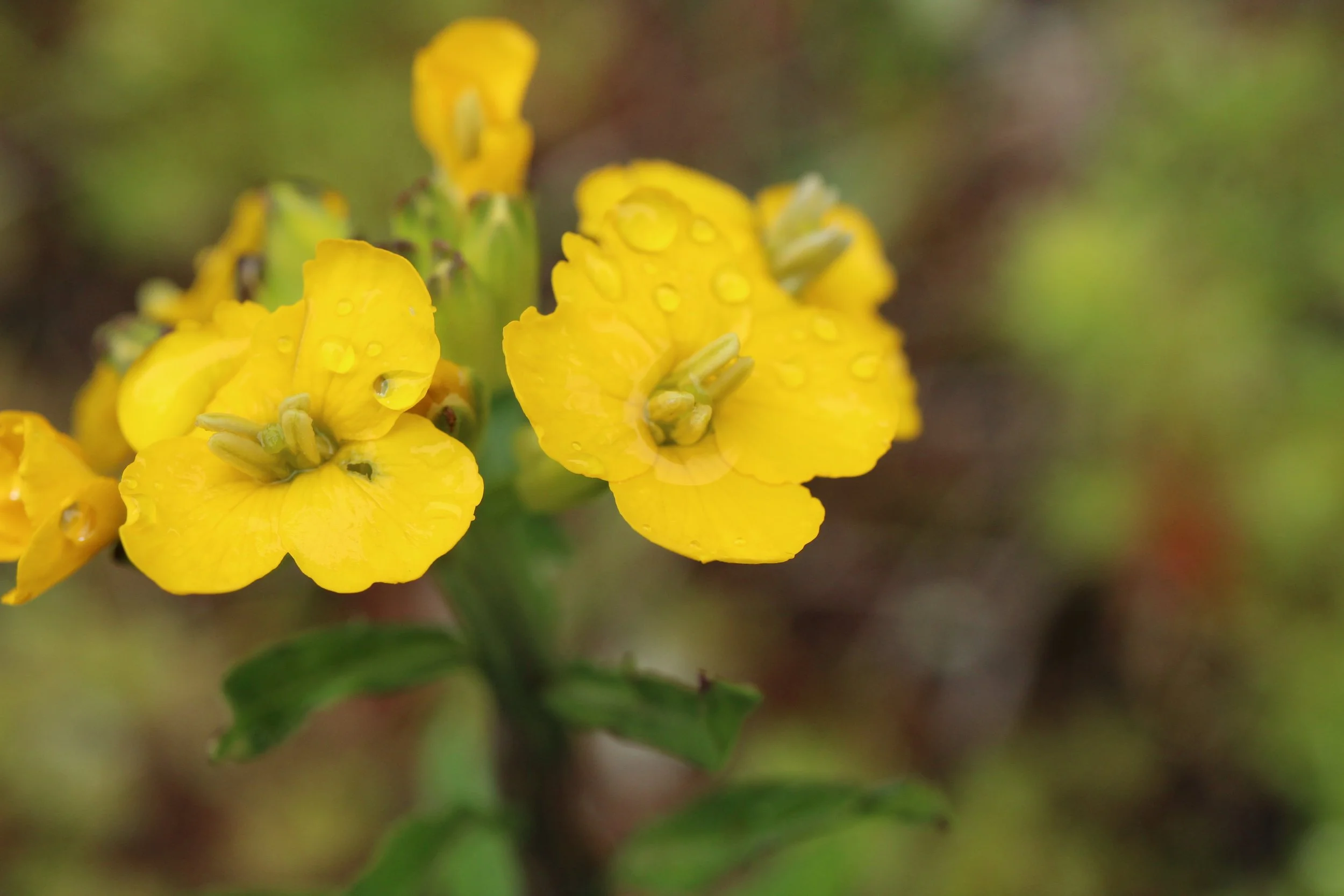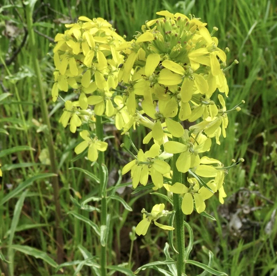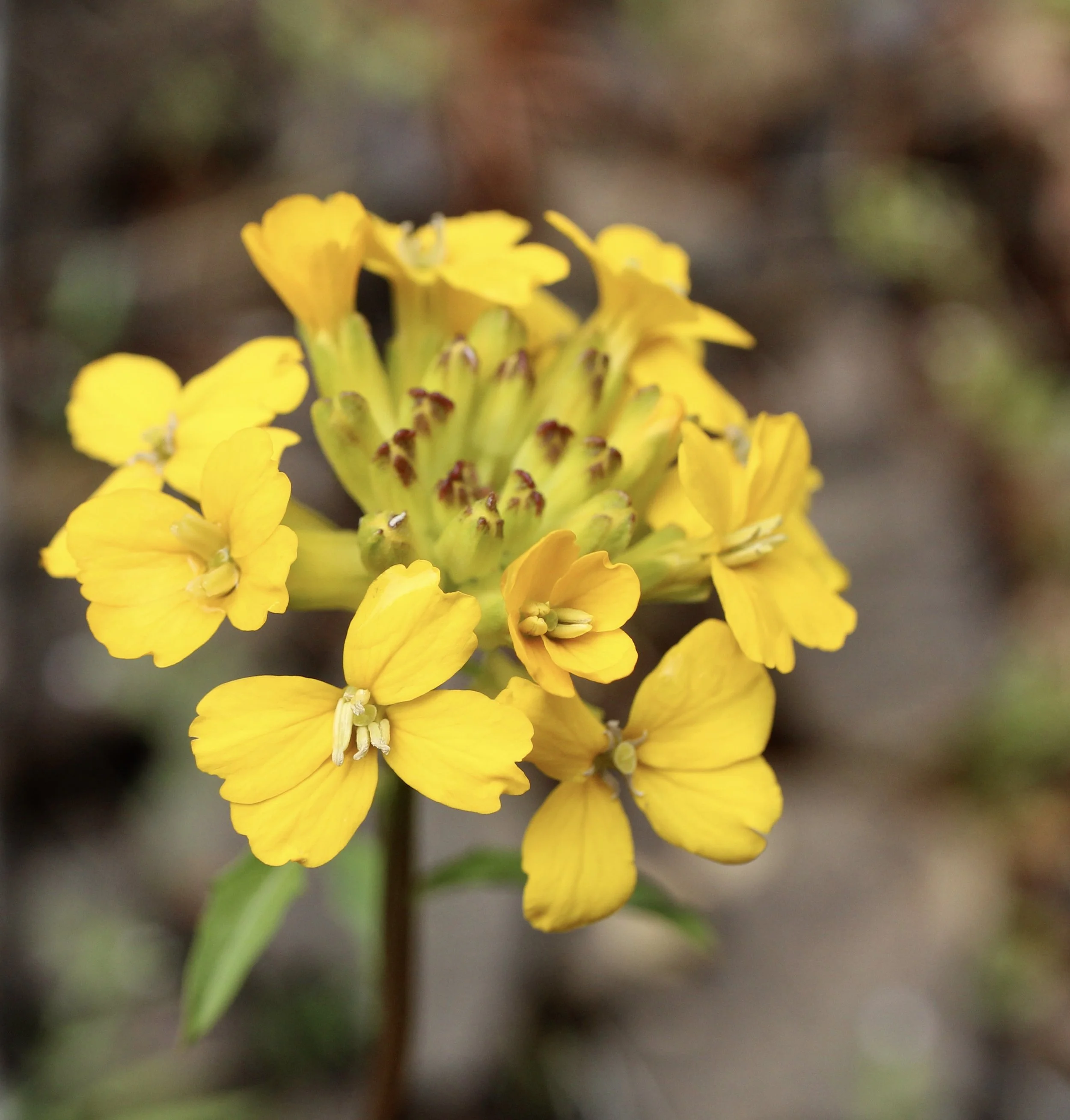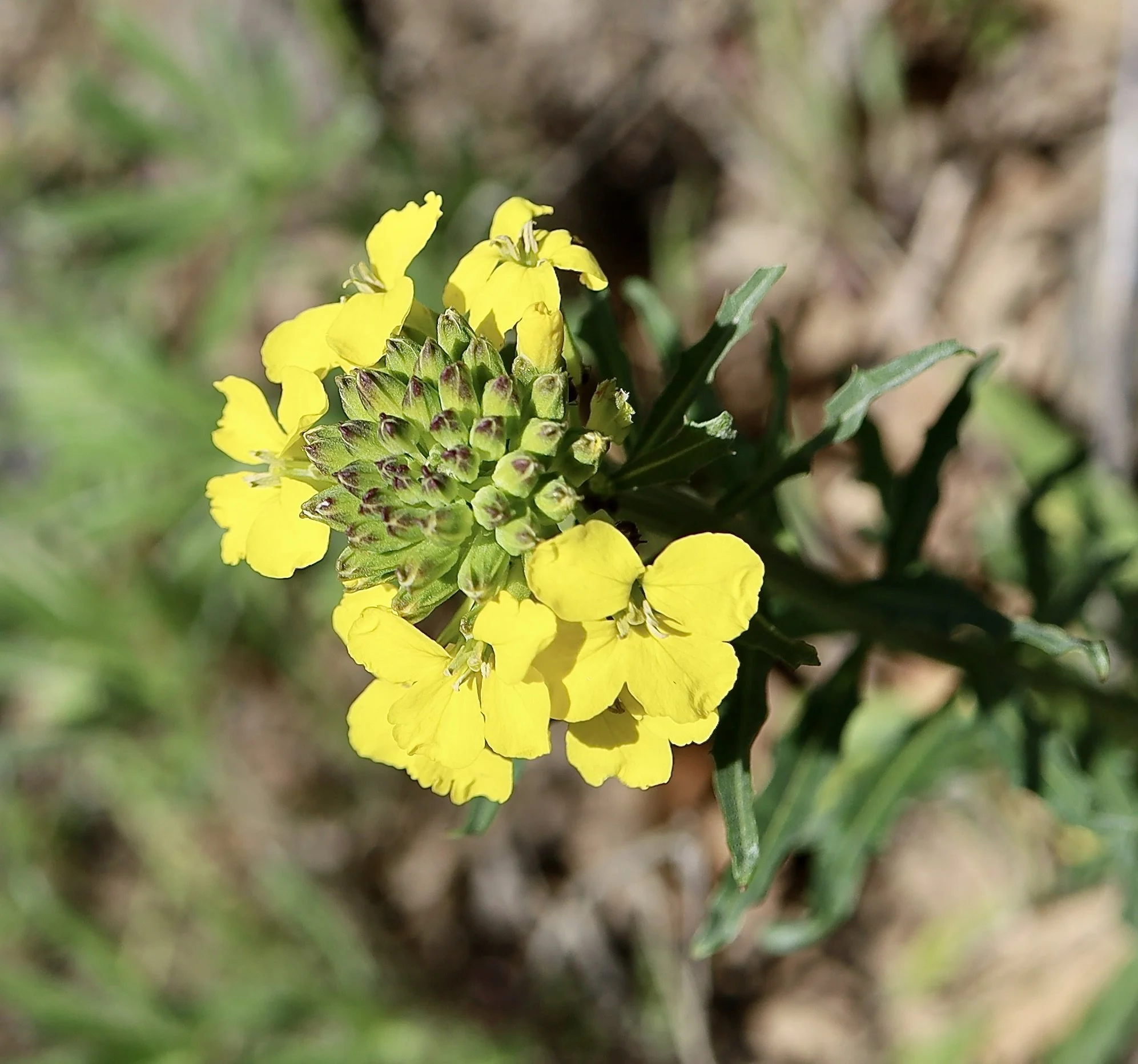 The Western Wallflower grows throughout the Pacific Northwest, on both sides of the Cascades. This wildflower has bright yellow, sometimes leaning to orange, flowers, each with four petals. Leaves are slender and long. There are six stamens, two are longer than the other four.