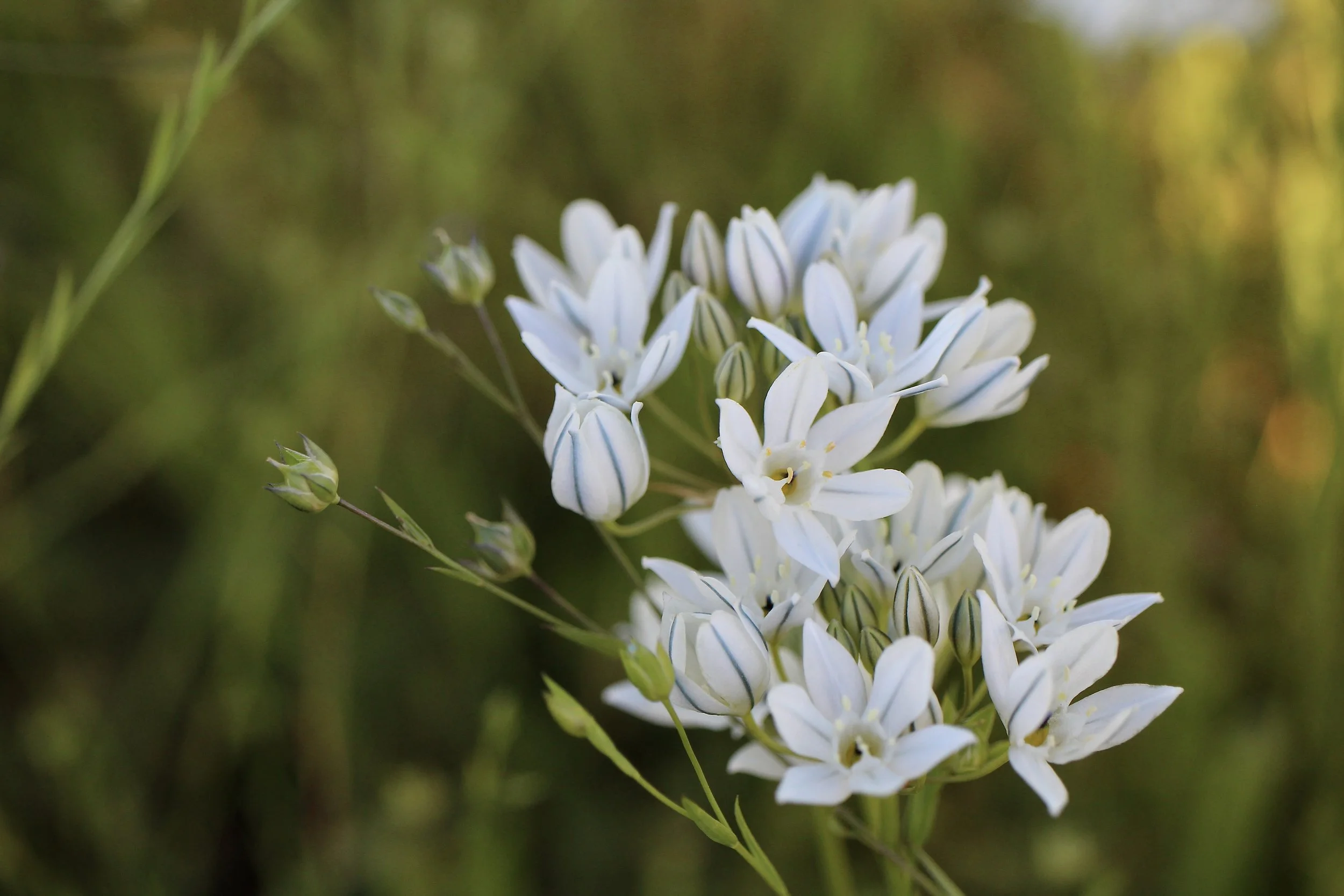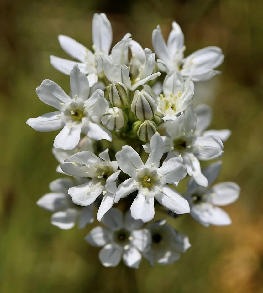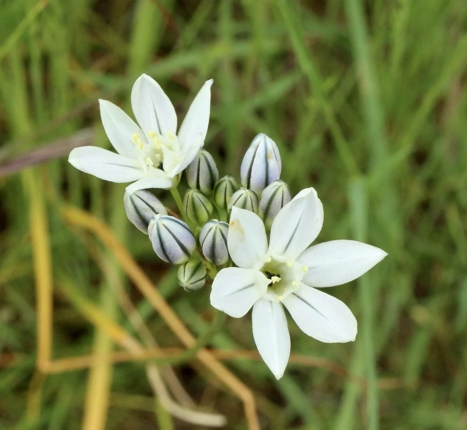The White Brodiaea is very similar to other Triteleia family members, like the Bi-colored Cluster Lily. The White Brodiaea has smaller flowers that are mostly white with just blue or green mid-vein. Their flowers are more bowl shaped compared to the more tubular shape of the other Triteleias. It likes growing in damp grasslands.