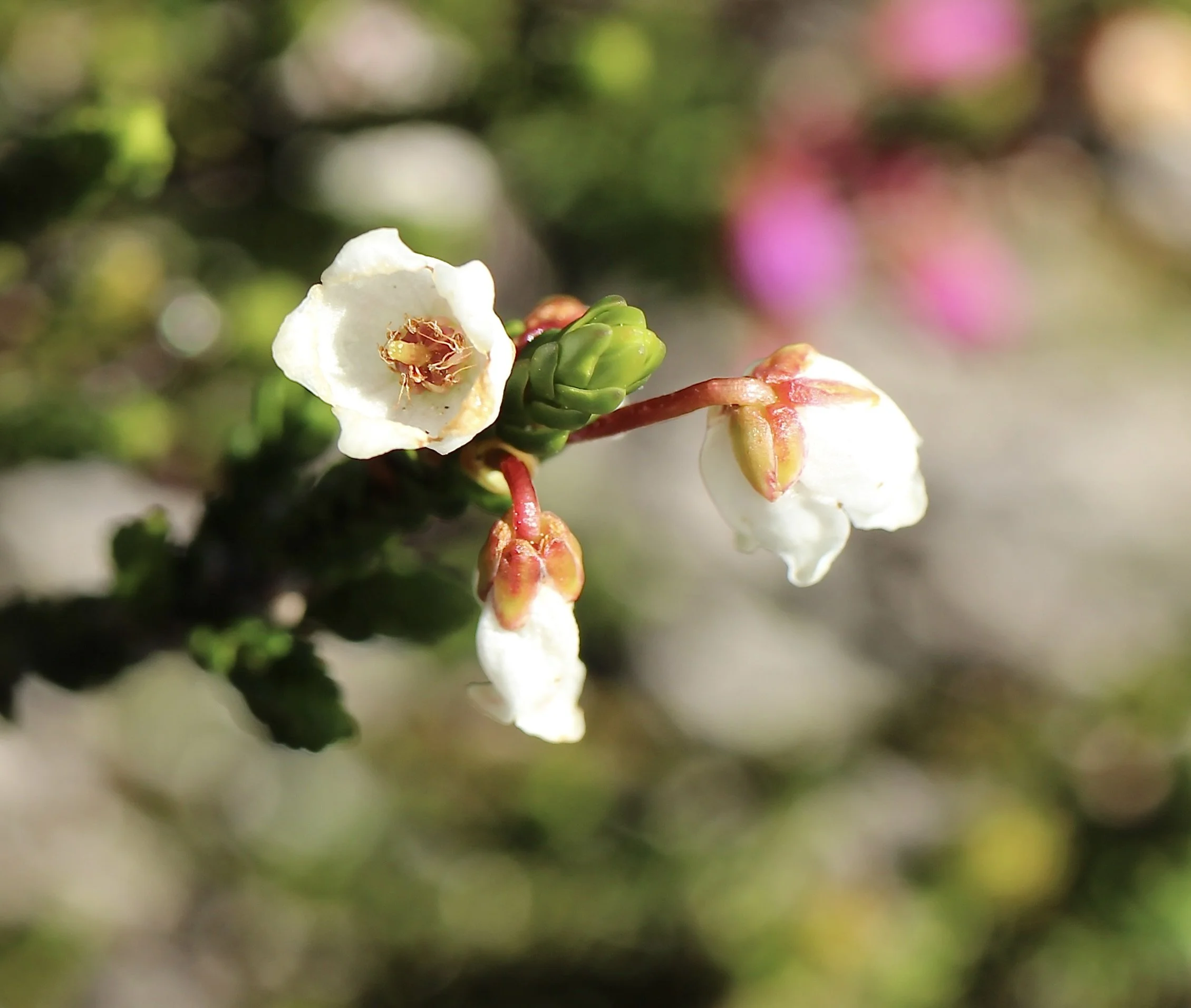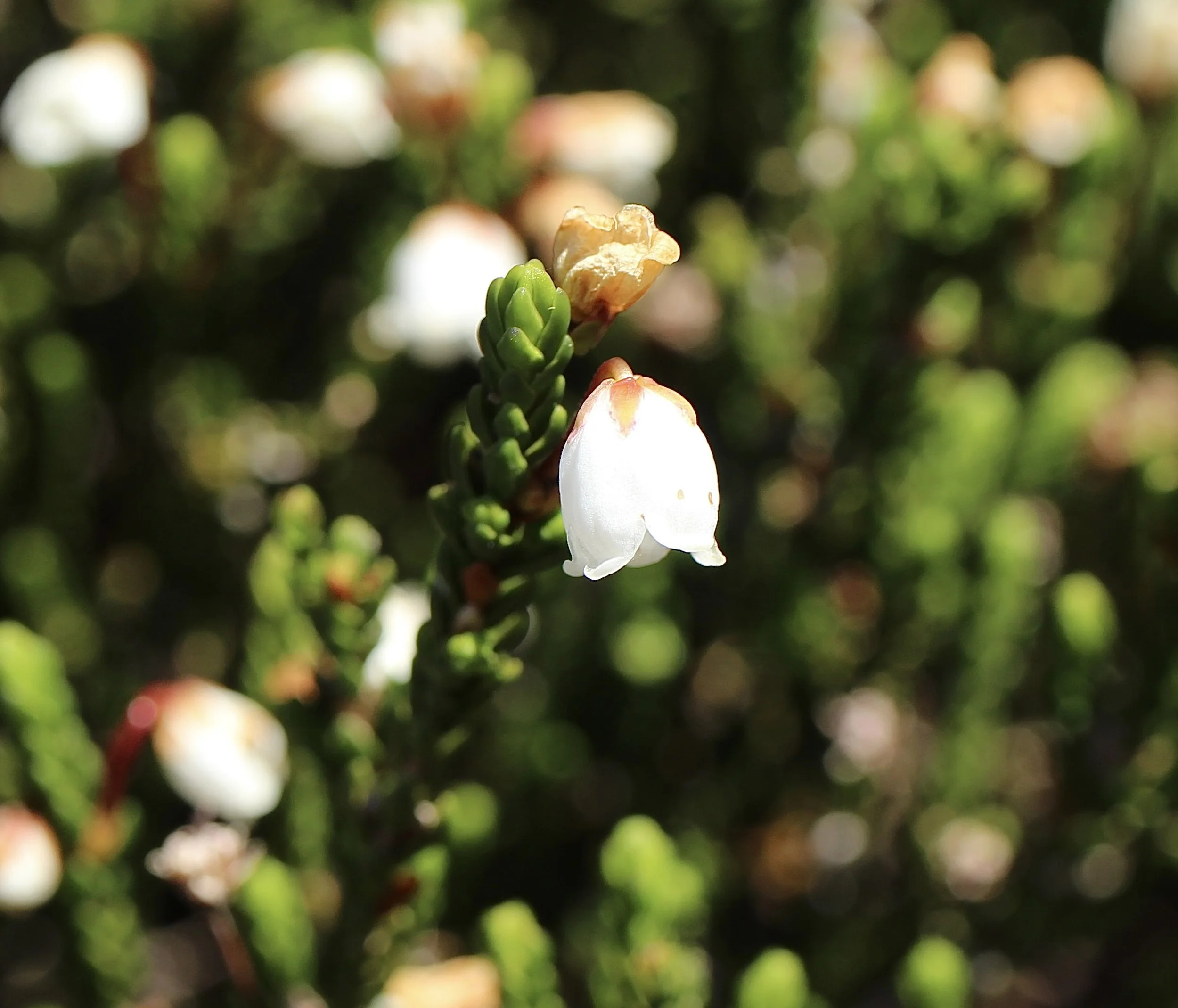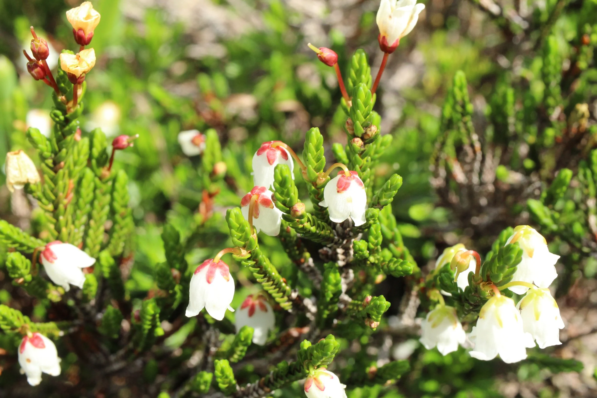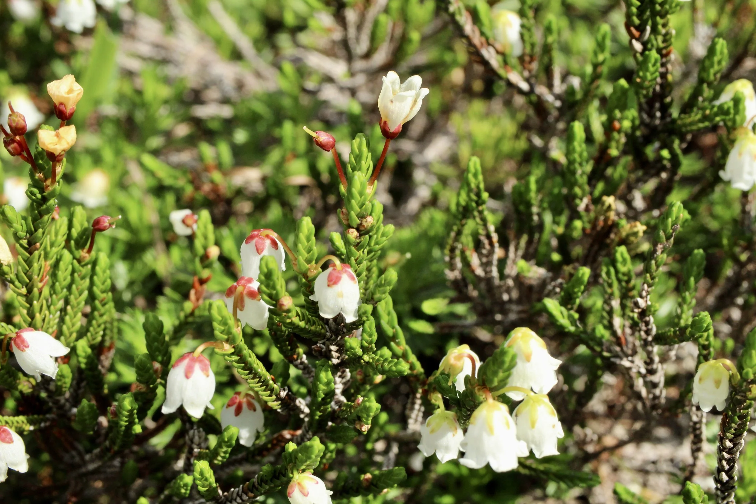 White Heather is a high altitude wildflower. The leaves are scaly and evergreen, and the flower is white. The flowers hang over like bells and are many on each stem. White Heather is a shrubby plant, usually in dense clumps, often near it’s relative, Red Heather.