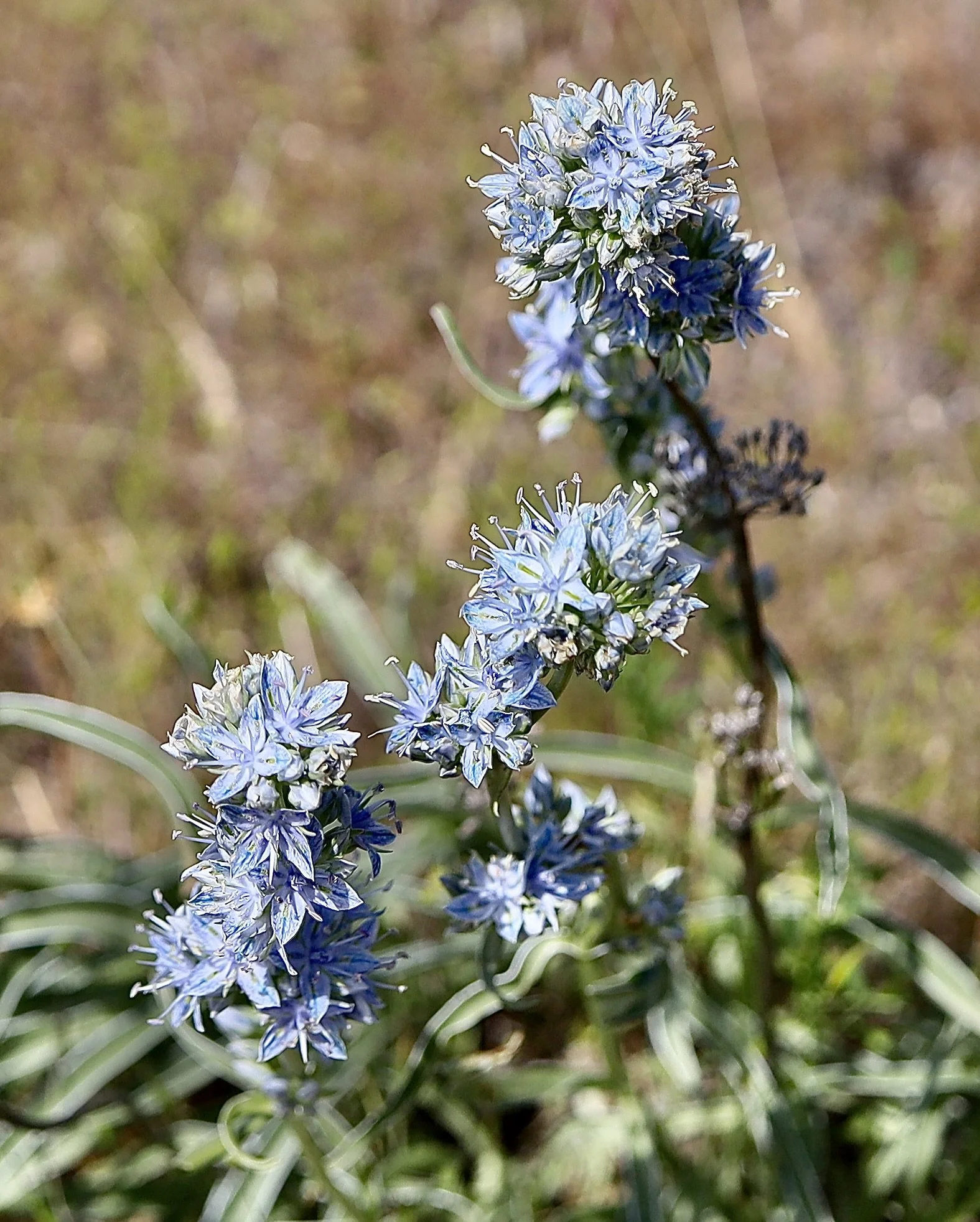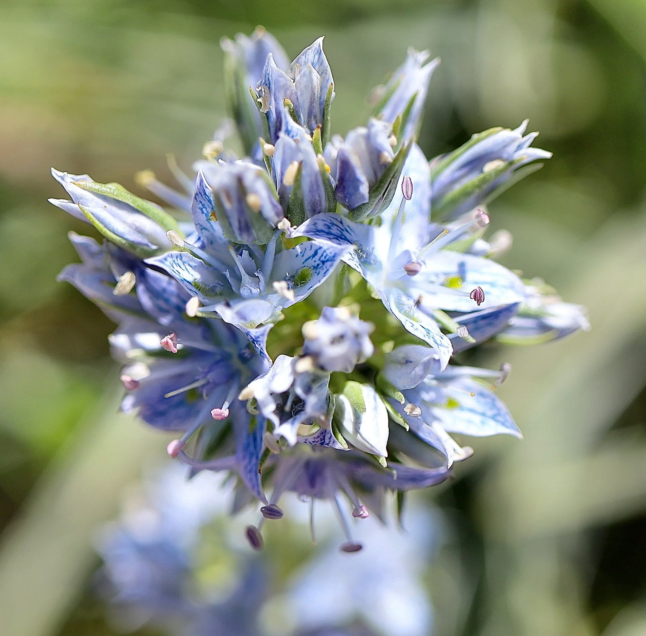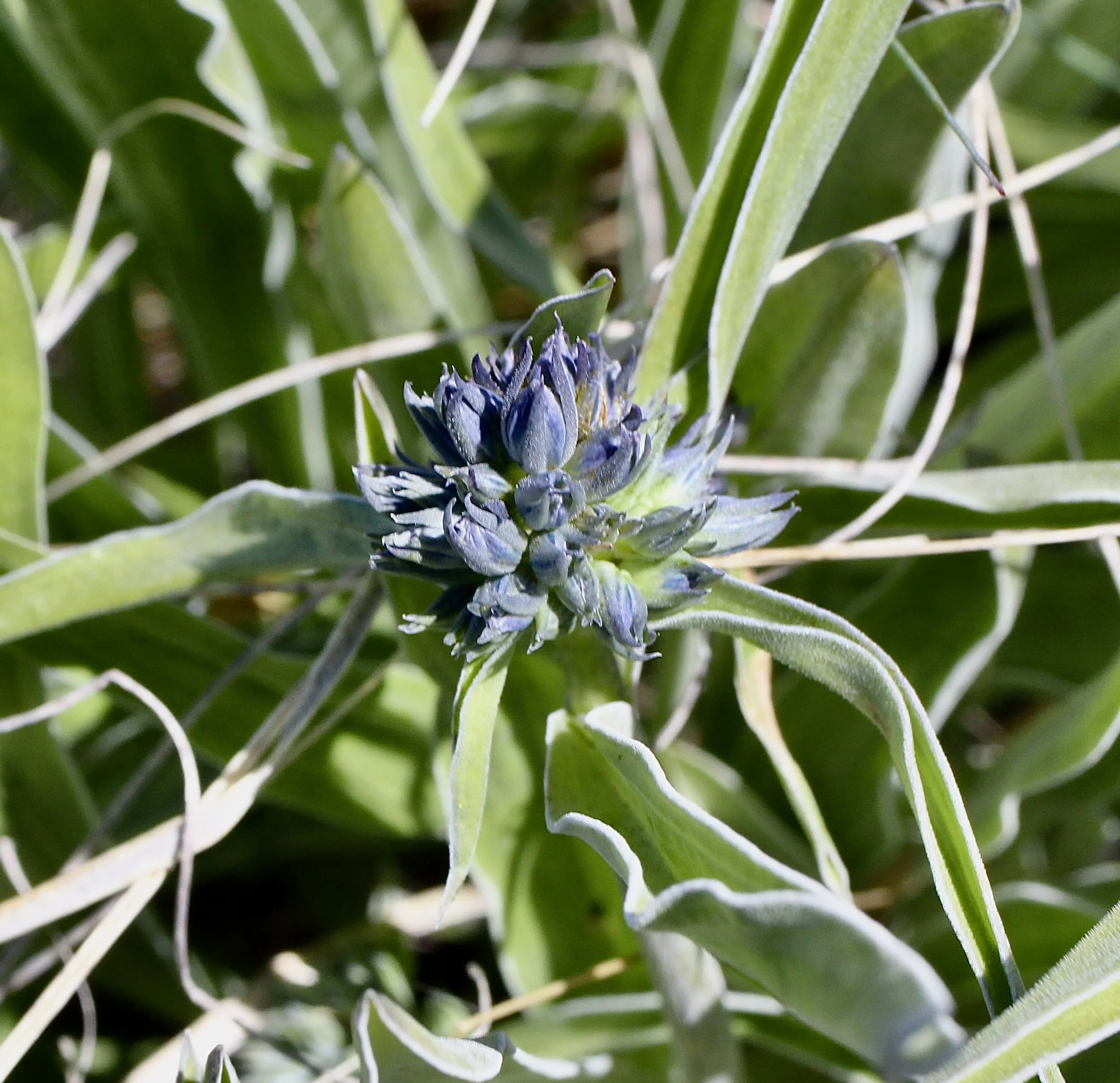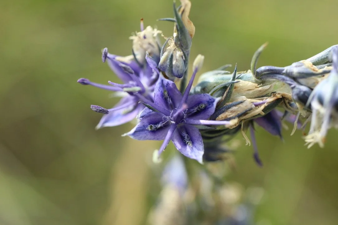 The Whitestem Frasera has distinct rosette of long leaves often showing white edges. The inflorescence has many flowers of pale blue to pale purple. Growing in meadows from low to mid elevations, the Whitestem Frasera has one close relative here in our area, the Monument Plant. The flowers are very similar except in color.