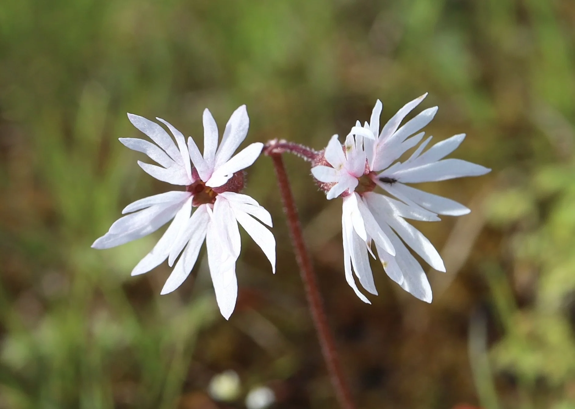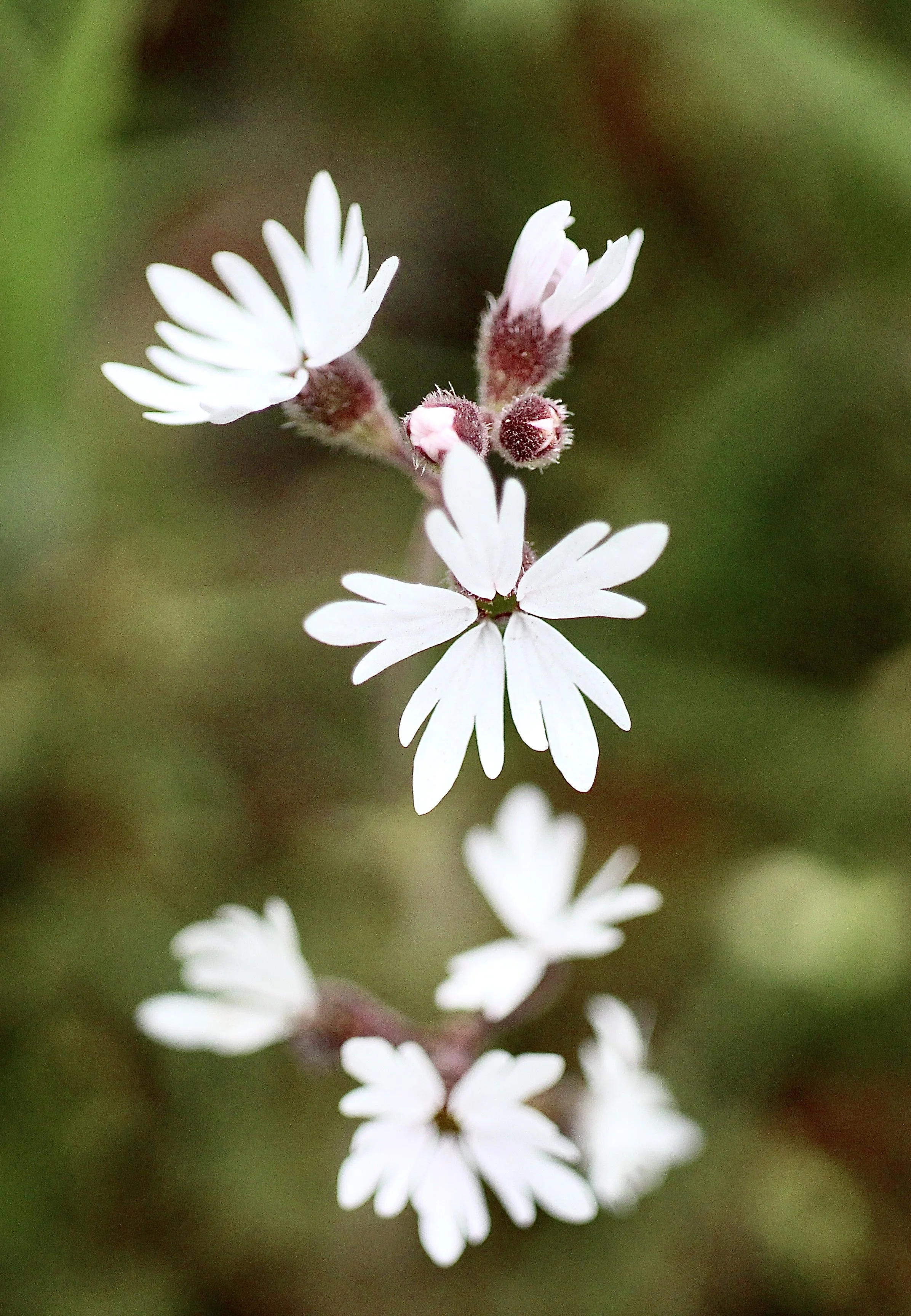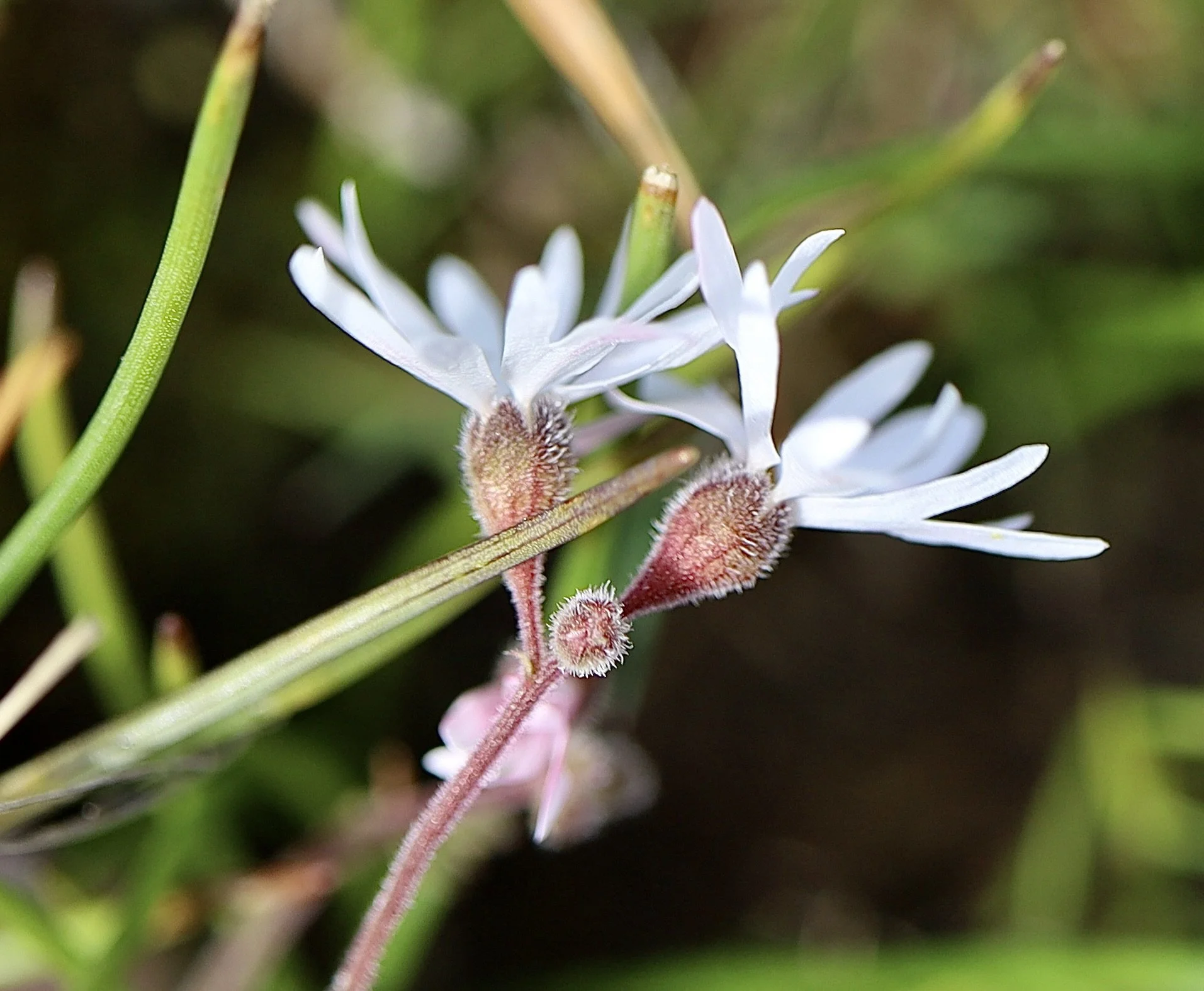 Prairie Stars. There are three types of prairie stars here in the Pacific Northwest. They are all very similar in looks and sometimes it is difficult to determine which is which. The Woodland Prairie Star, Lithophragma parviflorum typically has three lobes to each flower petal; is more usually white than pink; and has a tapered calyx, at the lower end of the flower. The Lithophragma tenellum is very similar, but has a more rounded calyx.