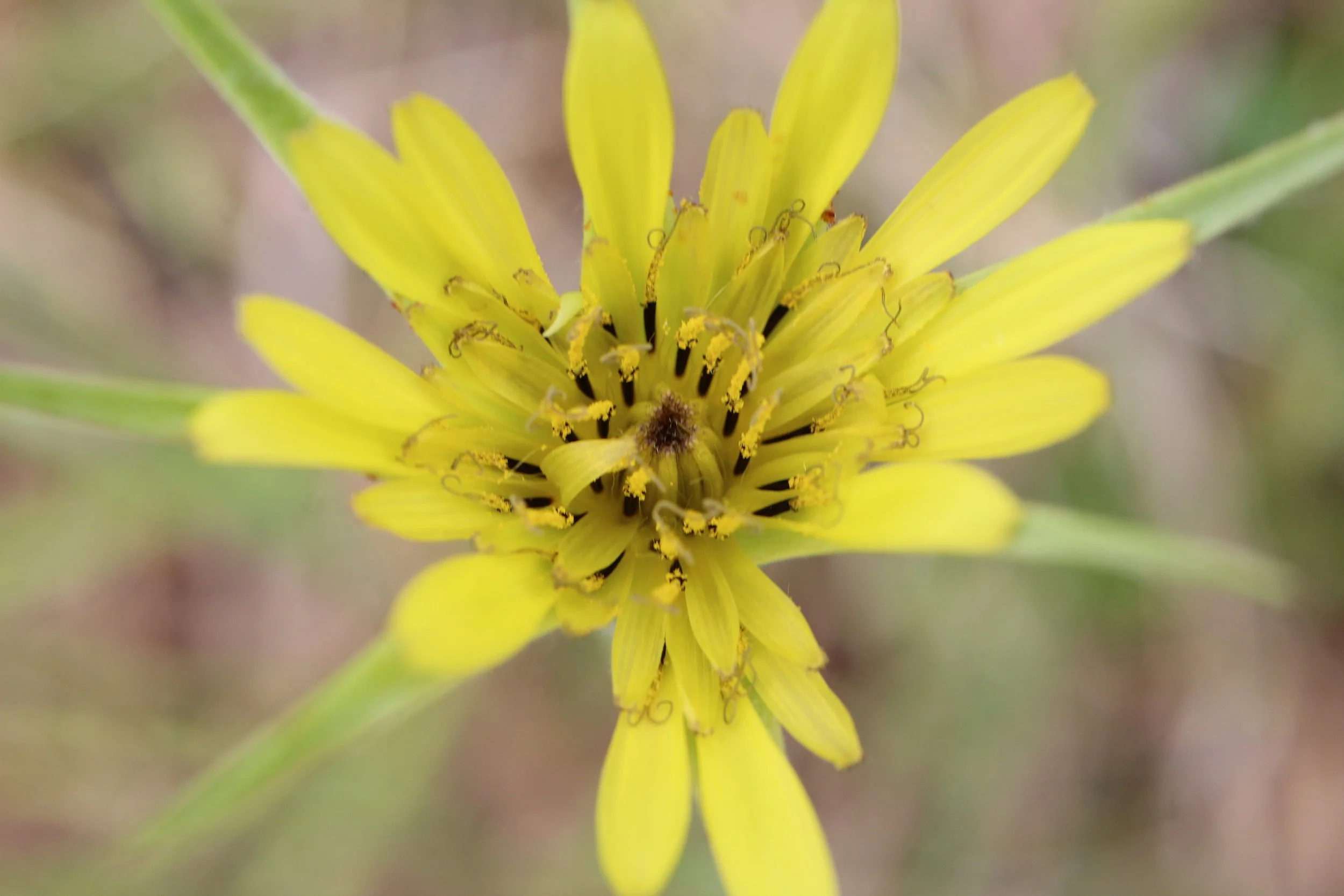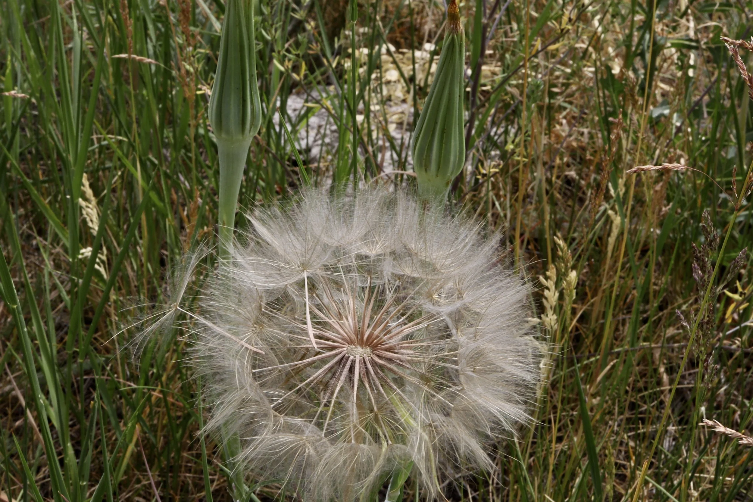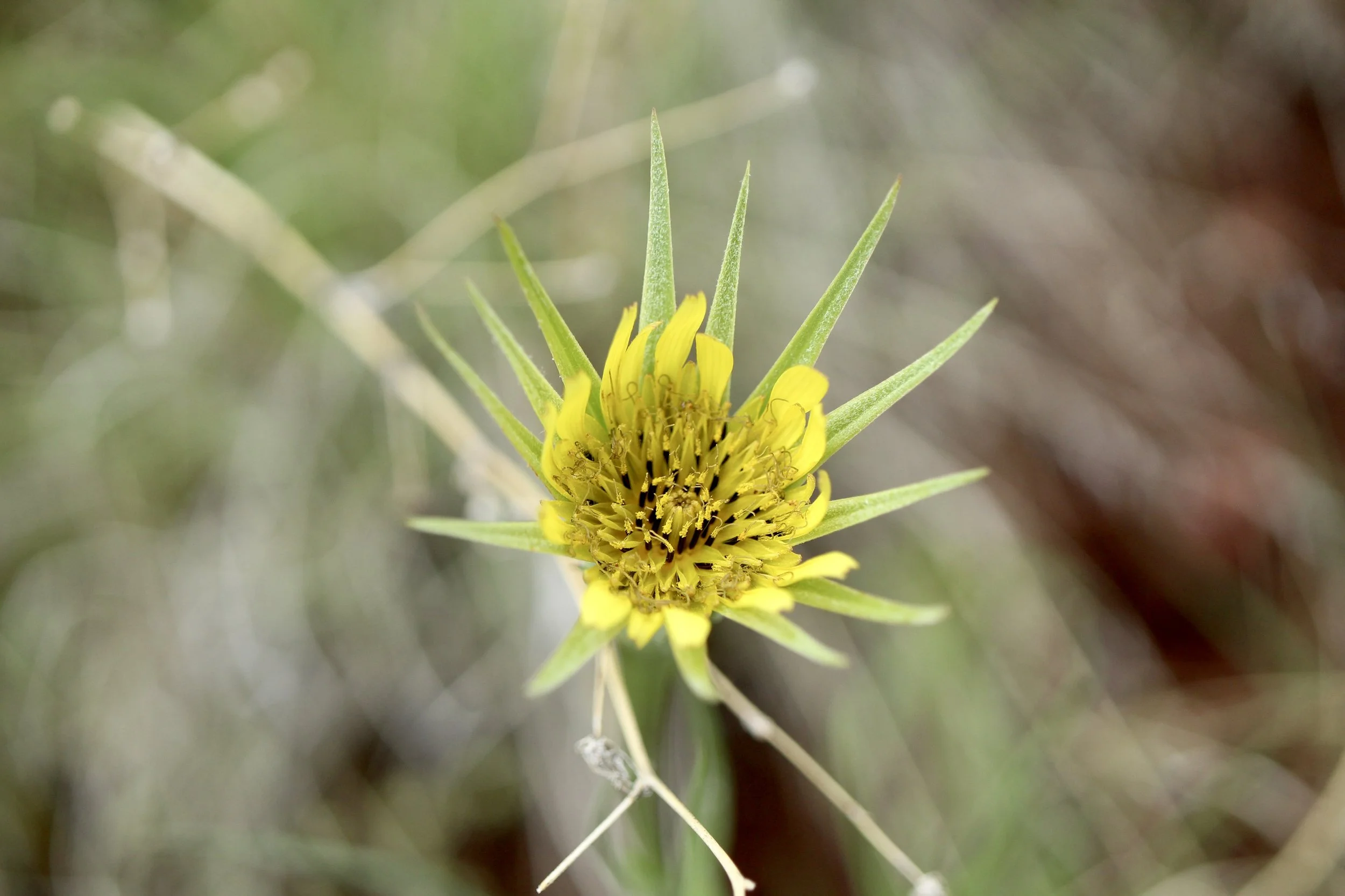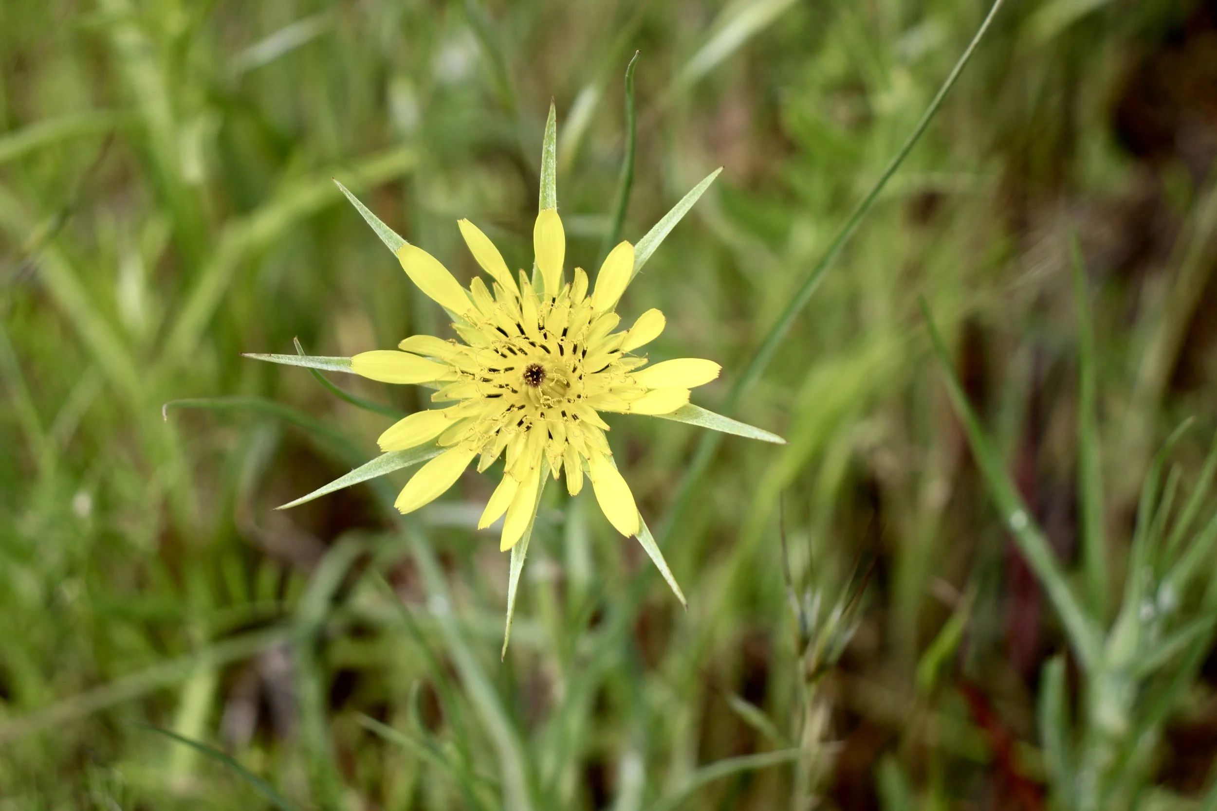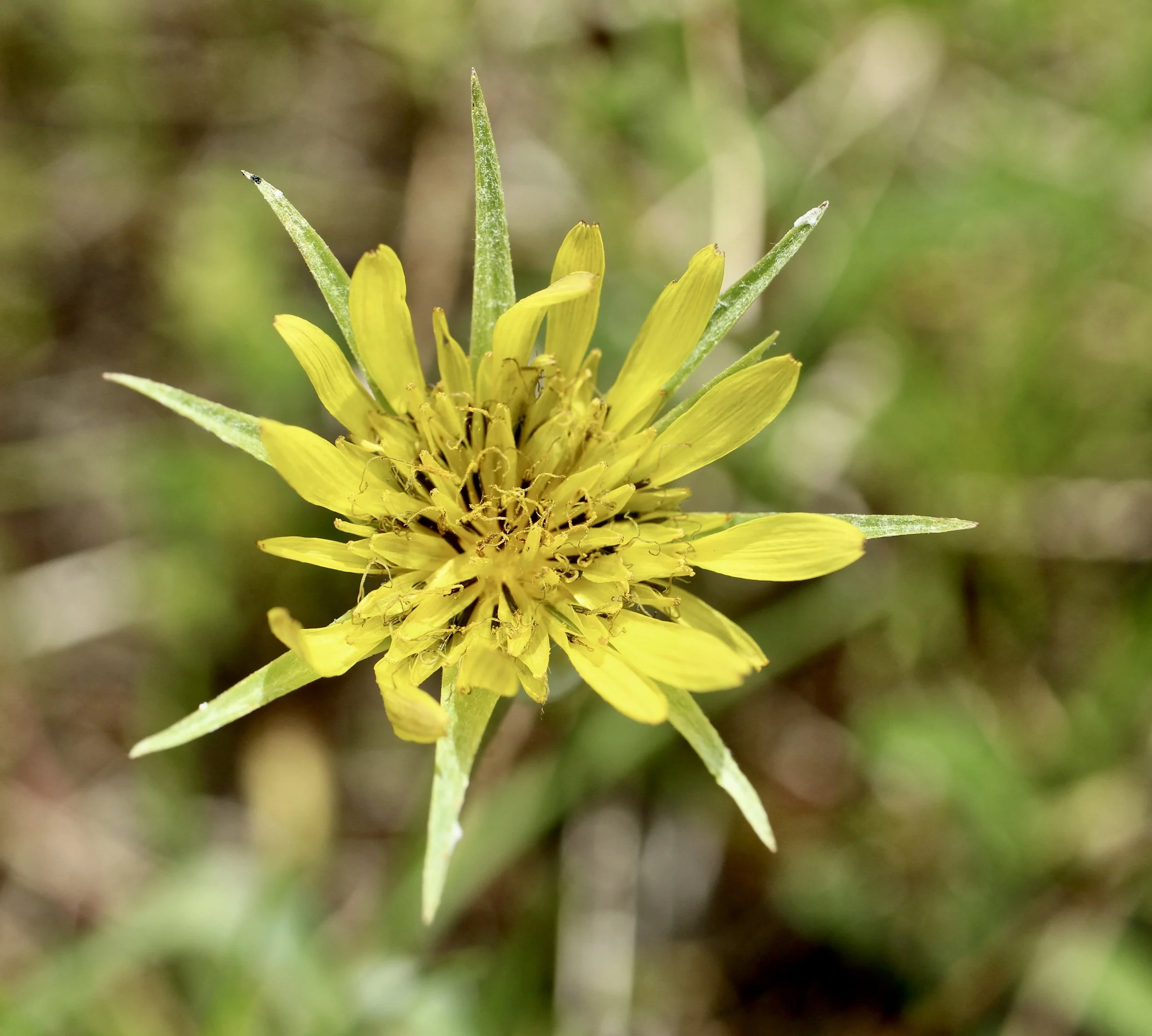 Yellow Salsify is sometimes called Yellow Oyster Plant. This is a tall wildflower, ranging up to two feet tall. The flower has bracts that are longer than the petals and green instead of bright yellow like the petals. The leaves are grasslike, thin and tall. When the Yellow Salsify ages and goes to seed, the seed heads are very geometric looking.